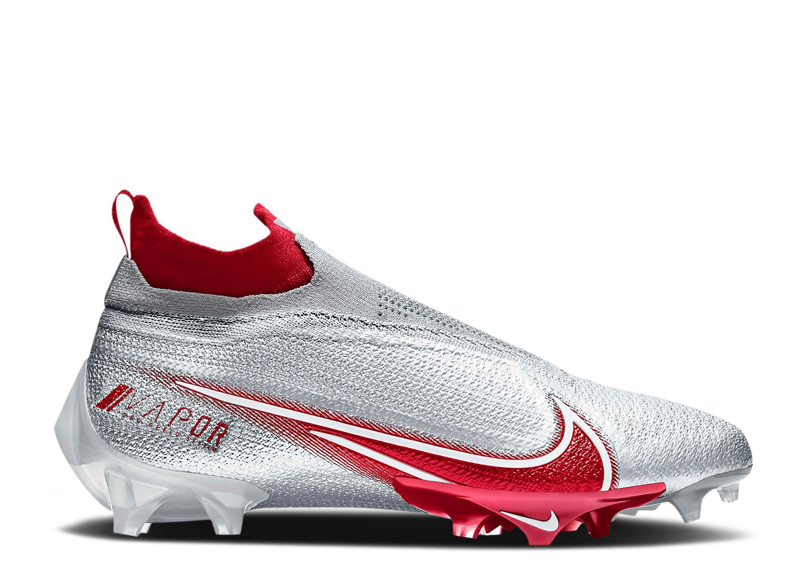 The Vapor Edge Elite 360 Flyknit 'University Red' features a vibrant two-tone look on its performance football construction. The shoe's upper is built with Flyknit, finished in Metallic Platinum and contrasted by University Red. NikeSkin and a Ghost lacing system support the fit, while underfoot, the outsole incorporates wide studs for traction. SKU: AO8276 008 Colorway: Metallic Platinum/Wolf Grey/University Red Release Date: 4/16/20