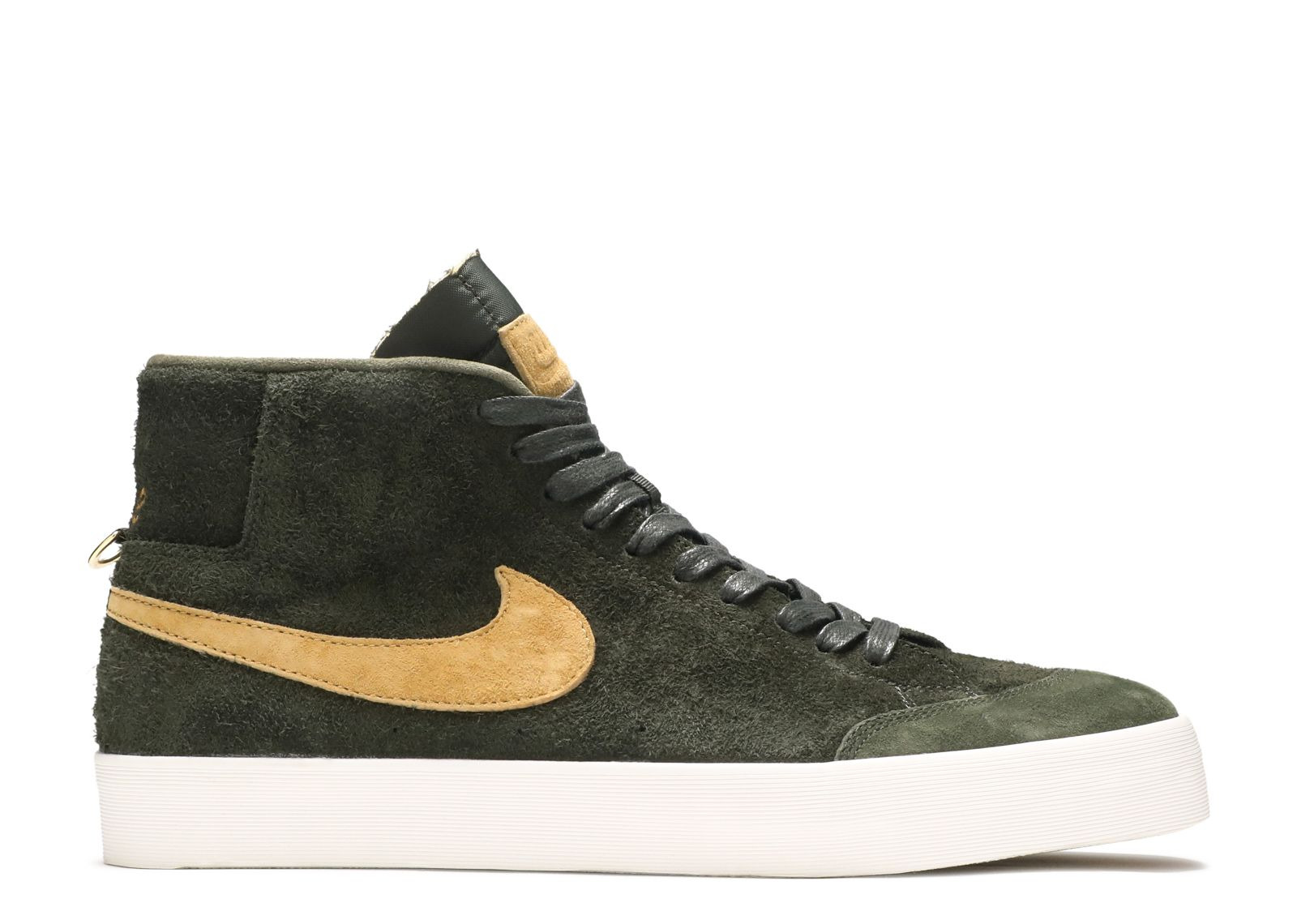 Nike SB and WE CLUB 58 join forces for a collaborative SB Blazer Mid QS. Featuring a shaggy, sequoia-colored upper, the sneaker features contrasting gold detailing on the Swoosh, tongue, and heel branding. Completing the look are a white midsole, gum rubber outsole, branded insoles, and heel hook. SKU: AH6158 369 Colorway: Sequoia/Flight Gold Release Date: 5/19/18