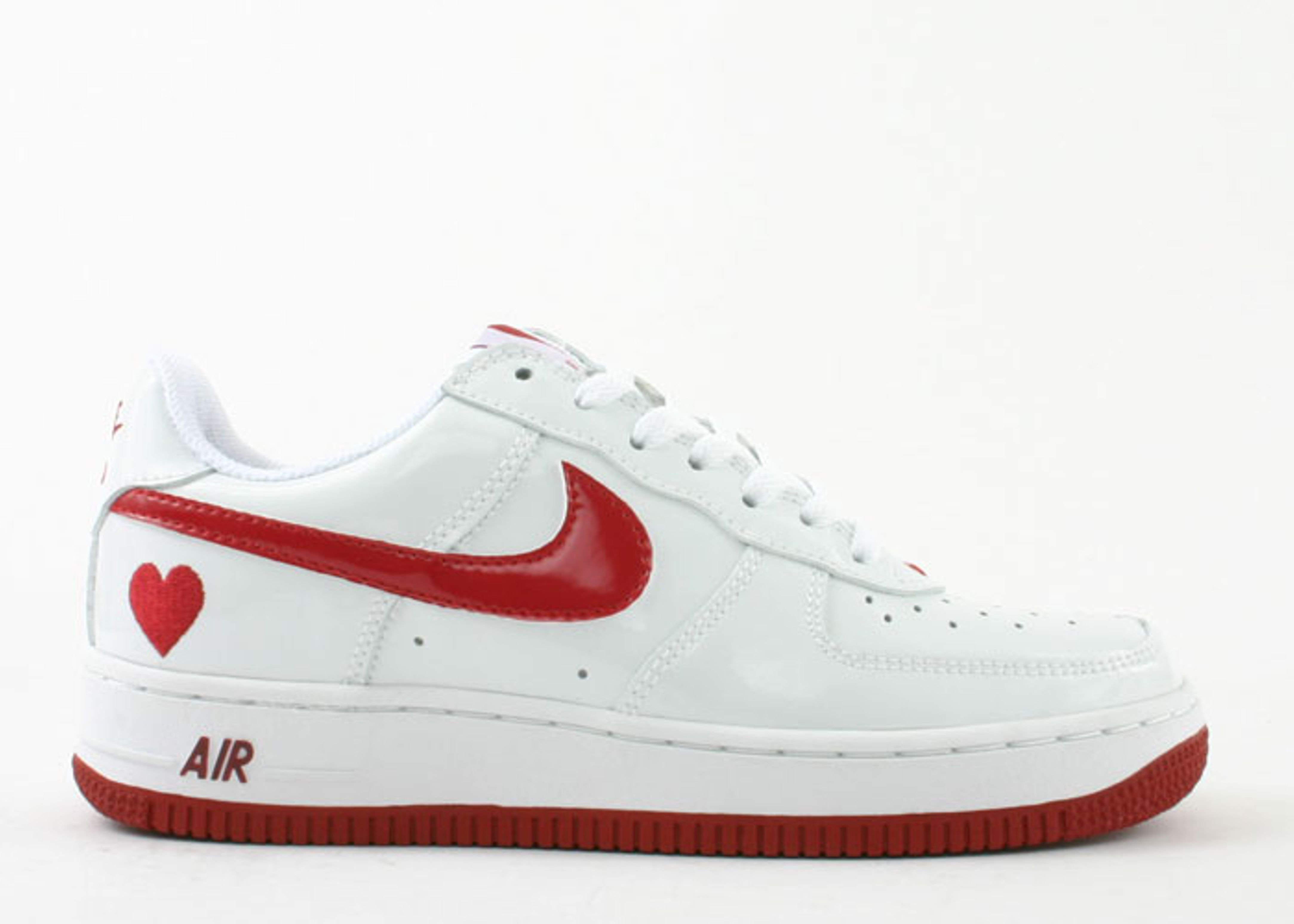 Released to help celebrate Valentine's Day in 2004, this Wmns Air Force 1 features a Varsity Red heart on the lateral heel. More Varsity Red appears on the Swoosh, heel and tongue branding, while the rest of the upper appears in white. The midsole houses Air in the heel, with a circular pattern on the outsole for traction. SKU: 307109 161 Colorway: White/Varsity Red (V Day) Release Date: 1/1/04