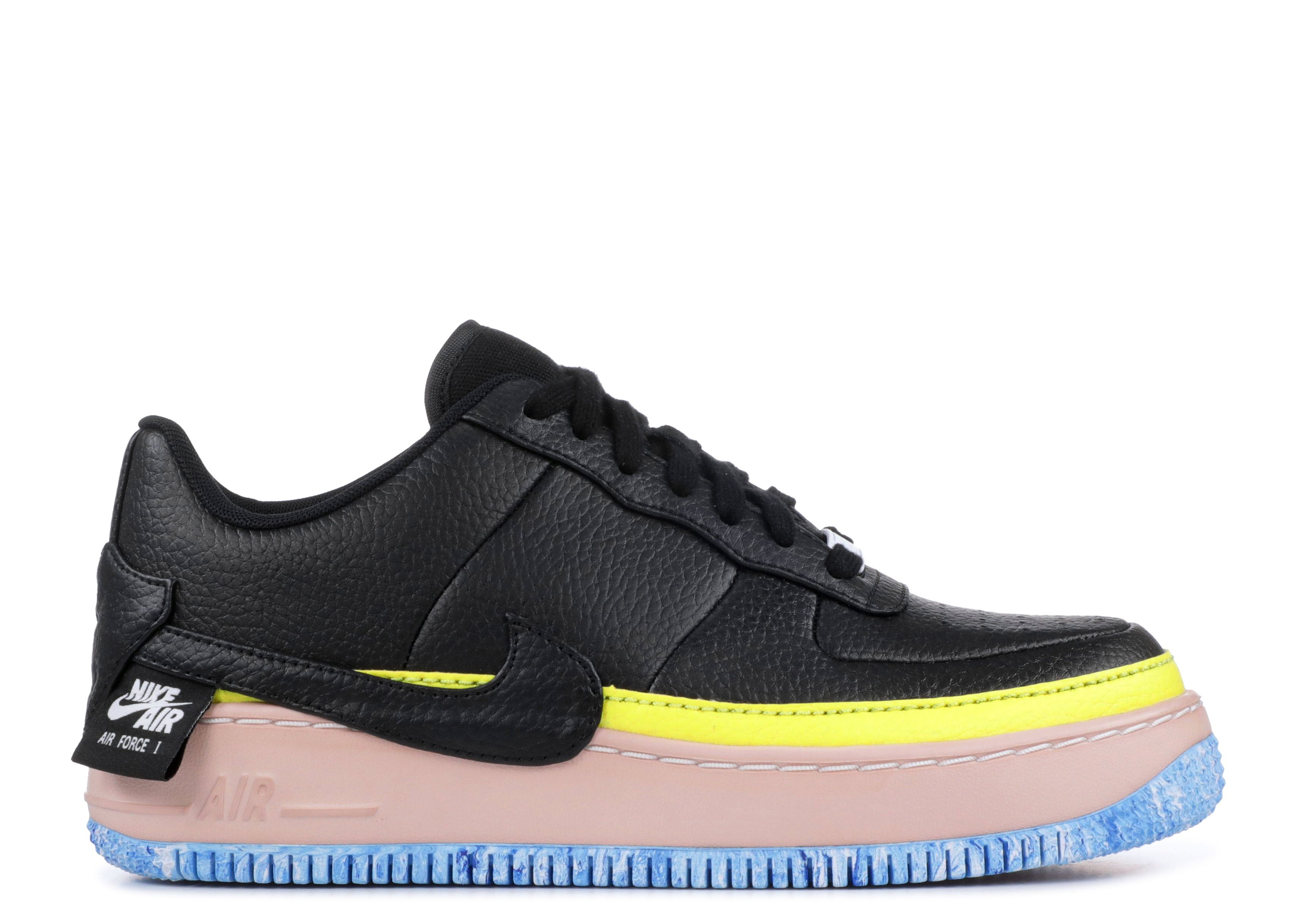 The women’s Air Force 1 Jester ‘Black’ delivers a whimsical reimagining of the classic sneaker. Constructed from black tumbled leather, the upper is distinguished by misplaced branding elements that creates a haphazard aesthetic. Contrasting pops of color appear on a yellow raise sidewall, pink PU-wrapped midsole and marbled blue and white rubber outsole. SKU: AT2497 001 Colorway: Black/Sonic Yellow Release Date: 7/5/18