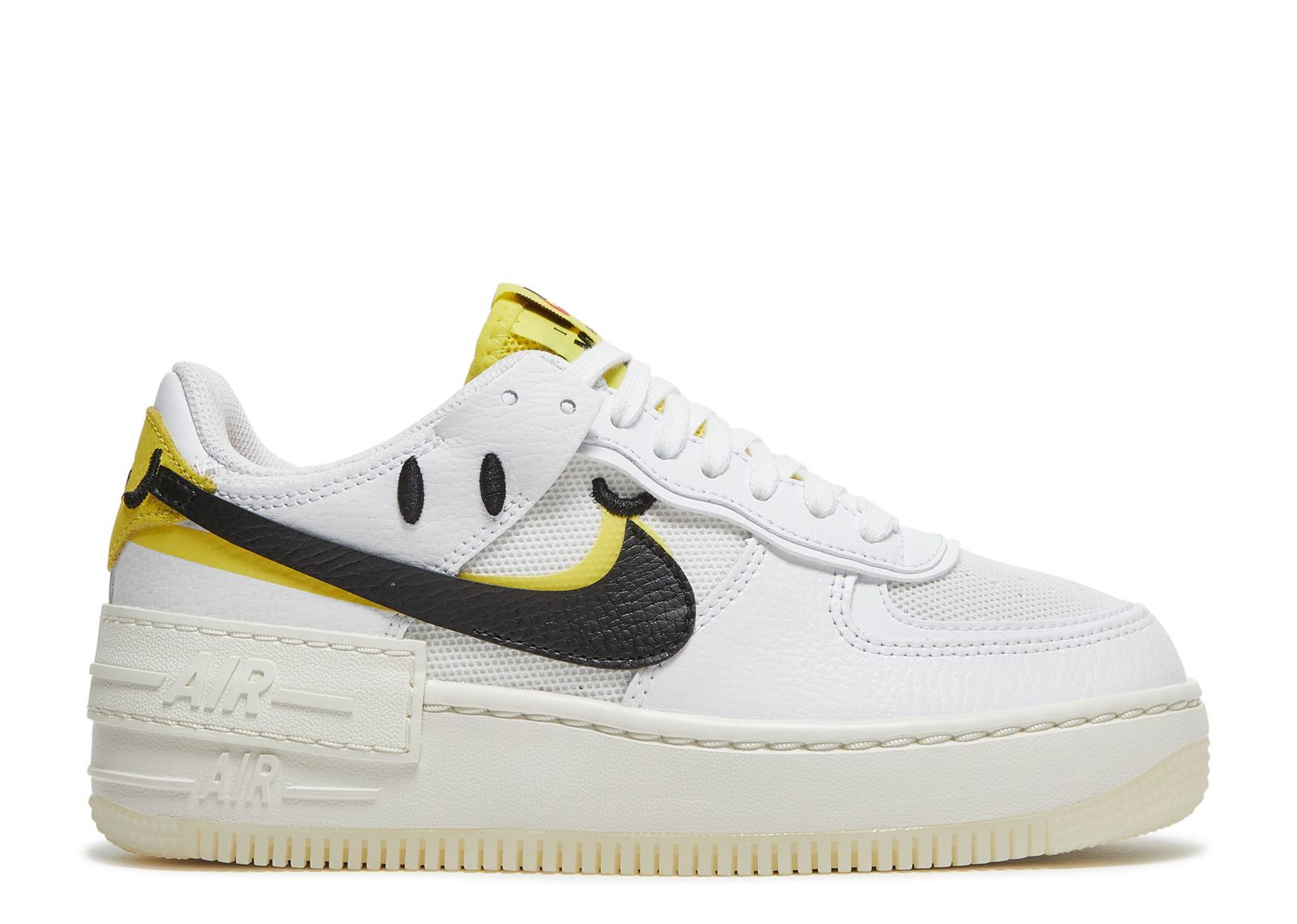The Nike women’s Air Force 1 Shadow ‘Go the Extra Smile’ delivers a spirited reinterpretation of a retro favorite. Underfoot, the standard AF1 midsole is oversized and rides on a cored-out outsole framed by clear rubber. The white mesh paneled base is highlighted by the matching leather two-layer eyestay and forefoot overlay with pops of yellow on the mesh tongue and heel tab, the latter in crackled leather. The signature Swoosh appears on the lateral side and is highlighted by a smiley face graphic. SKU: DO5872 100 Colorway: White/Yellow Strike/Team Orange/Black Release Date: 11/29/21