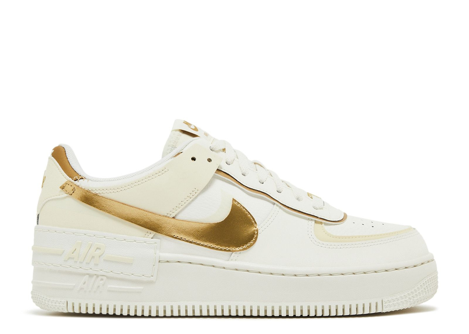 The Nike Women's Air Force 1 Shadow 'Sail Metallic Gold' has an off-white and cream leather upper, layering areas like the eyestay, forefoot and back tab. A floating, metallic gold Swoosh adorns the side, matching the tongue tag and molded AF1 lace jewel. A beefy, platform-like rubber midsole contains encapsulated Air-sole cushioning for a soft feel. SKU: DZ1847 108 Colorway: Sail/Coconut Milk/Metallic Gold Release Date: 11/4/24