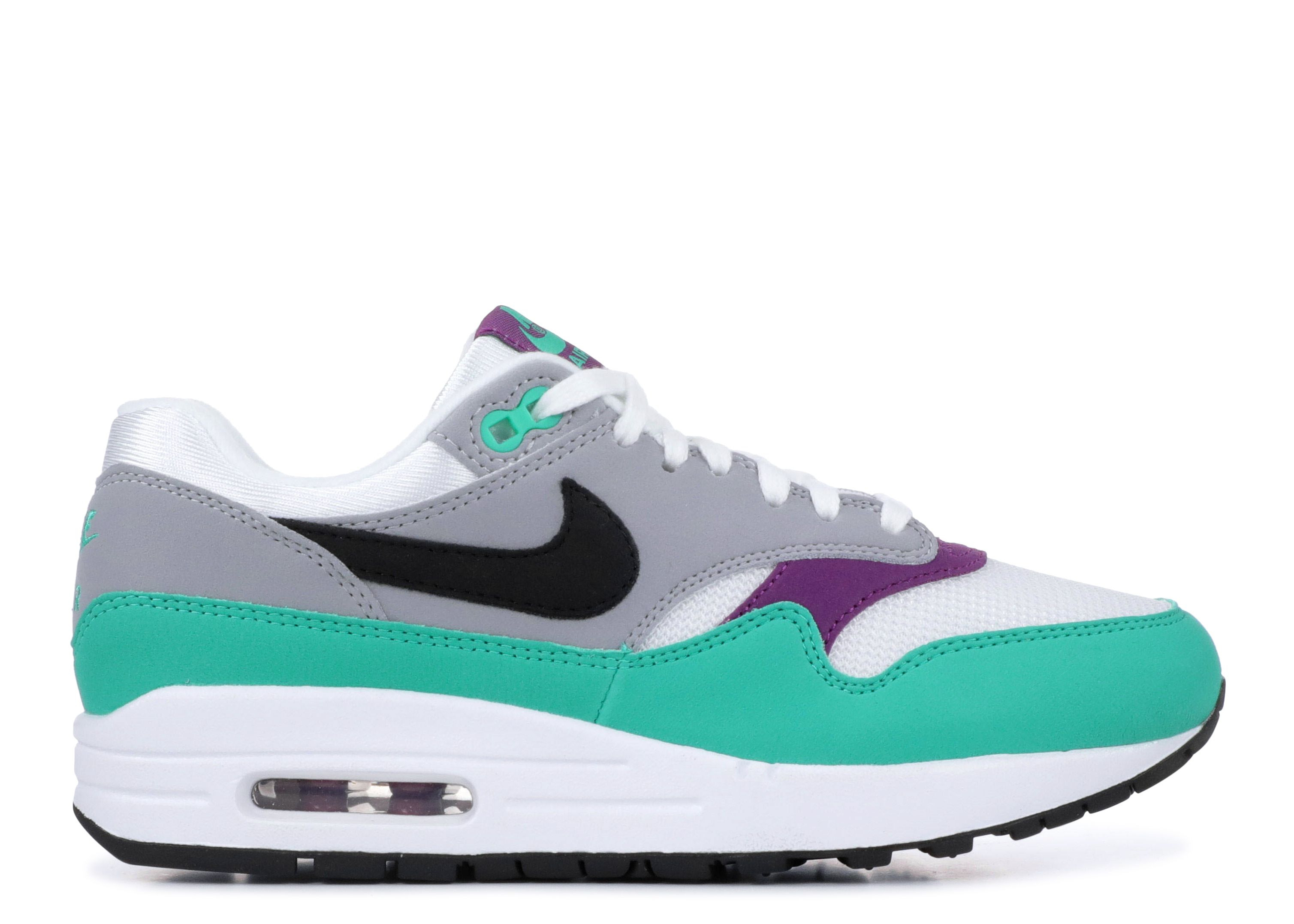 A women’s-exclusive style, the Nike Wmns Air Max 1 ‘Clear Emerald’ shoes sport bright purple accents on the midfoot overlay, contrasted by a teal mudguard. The same color combination is repeated on the tongue, heel logo, insoles, and throughout the exposed Air unit in the outsole for a distinct look. SKU: 319986 115 Colorway: White/Black/Wolf Grey/Clear Emerald Release Date: 7/7/18