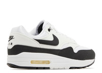 Synthetic suede-like material in Summit White pairs with white mesh for the Nike Women's Air Max 1 'White Black.’ The Swoosh, eyelets, and suede mudguard appear in black. It has a wedge-shaped white PU midsole with a visible Air unit in the heel for cushioning. SKU: DZ2628 102 Colorway: Black/White/Neutral Grey Release Date: 10/5/23