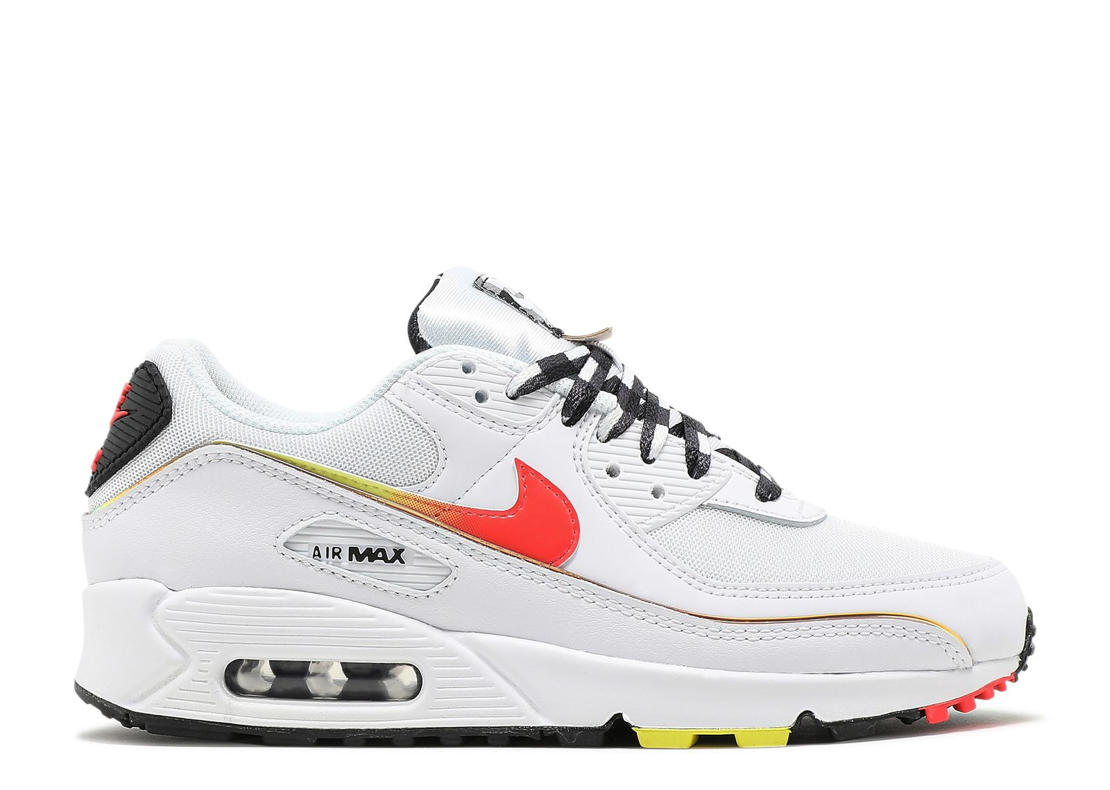 The Wmns Air Max 90 'Fresh' brings vibrant accents to its signature running construction. Built with a white textile base, the shoe's upper is overlaid by tonal leather, highlighted by a gradient Swoosh on the side wall and Nike Air branding on the heel patch. The mudguard adds iridescent piping to the look, while the laces and tongue tag include a black and white gingham print. Underfoot, visible Air in the heel offers cushioning. SKU: DJ5530 100 Colorway: White/Bright Crimson/Light Voltage Yellow Release Date: 5/18/21
