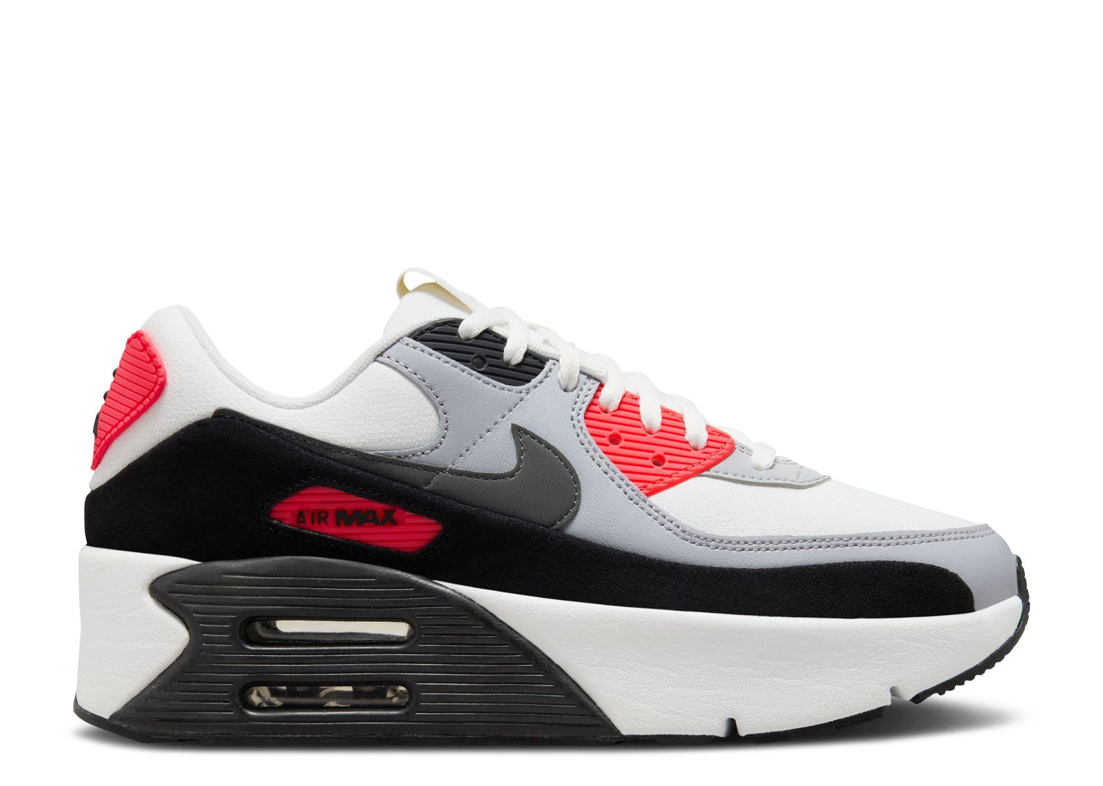 The Nike Women's Air Max 90 LV8 'Infrared' brings a white mesh upper accented with grey synthetic leather overlays. Infrared accents hit the eyelets, molded Nike Air heel patch and the Air Max logo embedded in the mudguard. These shoes rock a platform midsole with two Air-sole heel units stacked on top of one another. A waffle-patterned rubber outsole gives you strong traction underfoot. SKU: FD4328 101 Colorway: Summit White/Black/Wolf Grey/Smoke Grey Release Date: 2/3/24