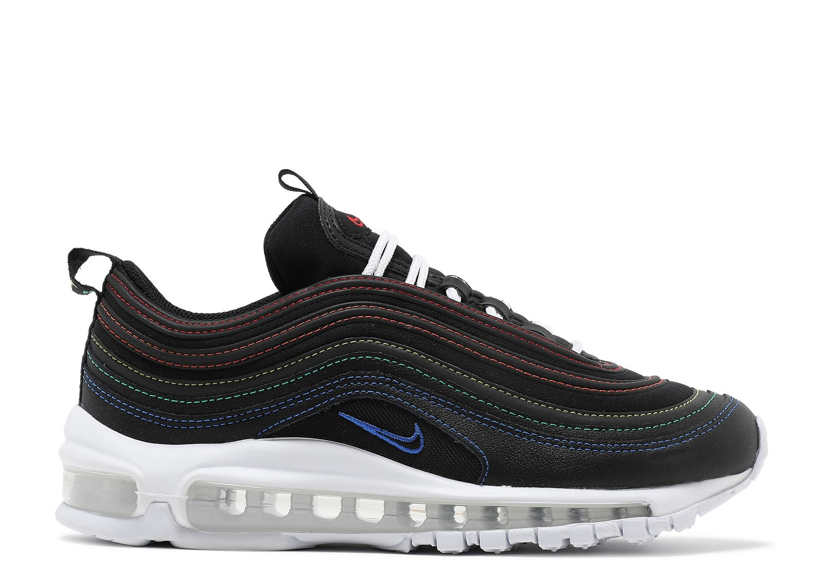 The Wmns Air Max 97 'Black' features a neutral base highlighted by vibrant stitching. The shoe's upper is built with textile, finished in black and overlaid by tonal leather. However, a rainbow of colors accents the look throughout, matched by the Air Max branding on the heel pull-loop, which offers easy on and off. Underfoot, a white polyurethane midsole provides cushioning and contrast, with visible full-length Max Air offering cushioning. SKU: DJ5999 001 Colorway: Black/Stadium Green/Opti Yellow/Hyper Royal Release Date: 5/2/21