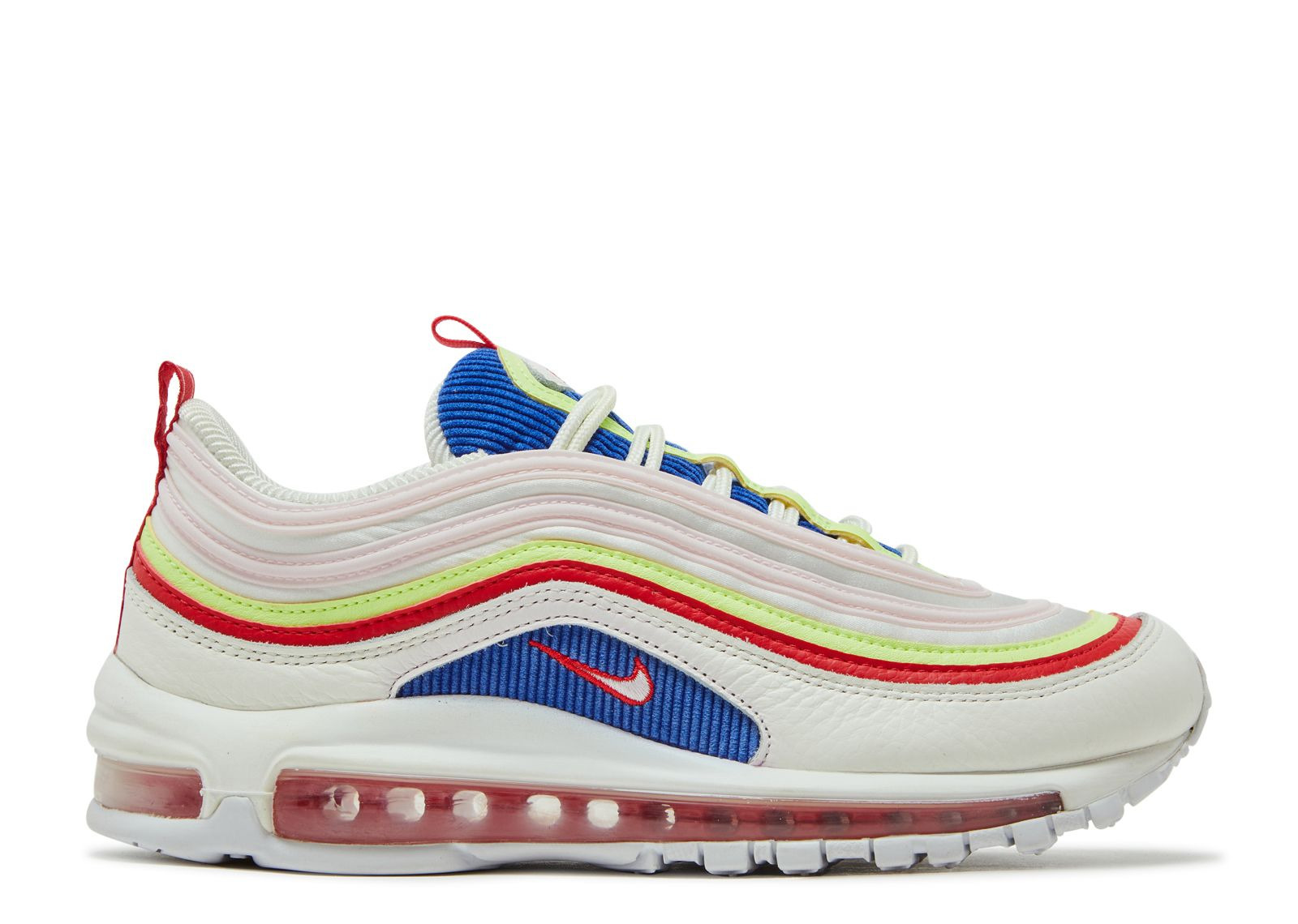 A luxe upgrade on the classic Christian Tresser-designed silhouette, the women’s Air Max 97 SE 'Panache' dresses its tongue and side panel in corduroy, while its signature waves are seen in color-blocked layers of leather. Completing the look is the sneaker’s trademark Max Air cushioning unit: full-length and exposed. SKU: AQ4137 101 Colorway: Sail/Arctic Pink-Volt Glow Release Date: 5/12/18
