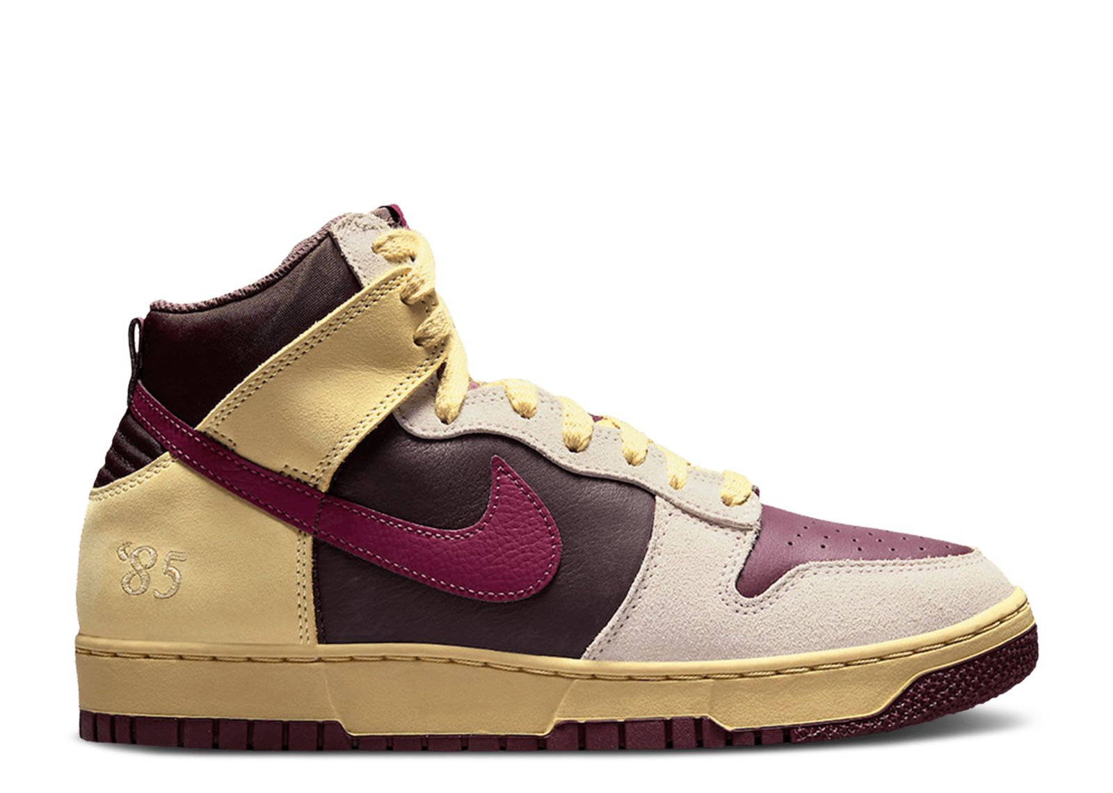 The Nike Women's Dunk High 1985 'Valentine's Day' pays homage to the romantic holiday with luxurious hues, premium materials and a classic silhouette that remains faithful to the shoe's original design. The upper is composed of a burgundy leather foundation, augmented with tan suede overlays at the forefoot and yellow leather overlays at the heel. A bold plum-colored Swoosh runs across the quarter panel, while the lateral heel is embellished by a stitched '85' graphic. The high-top is fitted with a rubber cupsole that has pre-weathered sidewalls and outsole appears in a deep maroon rubber hue. SKU: FD0794 700 Colorway: Alabaster/Rosewood/Earth/Night Maroon Release Date: 2/28/23