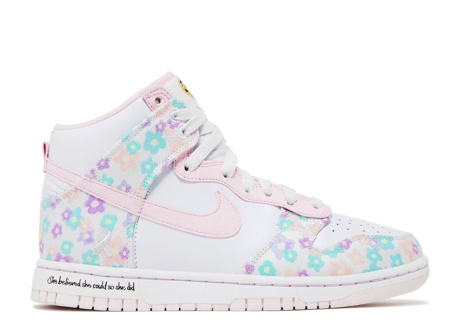 Part of the Doernbecher x Nike Freestyle Collection, Macey Bodily designed these Nike Dunk High shoes with hand-painted floral print overlays and a pink suede Swoosh adorning the white leather upper. A grey ribbon graphic on the side of the heel represents her battle with cancer while a chocolate chip cookie on the tongue tab nods to her favorite dessert. This high-top has a lavender midsole inscribed with the motto: "She believed she could so she did." SKU: FZ3026 919 Colorway: Multi-Color/Multi-Color/Multi-Color Release Date: 12/2/23
