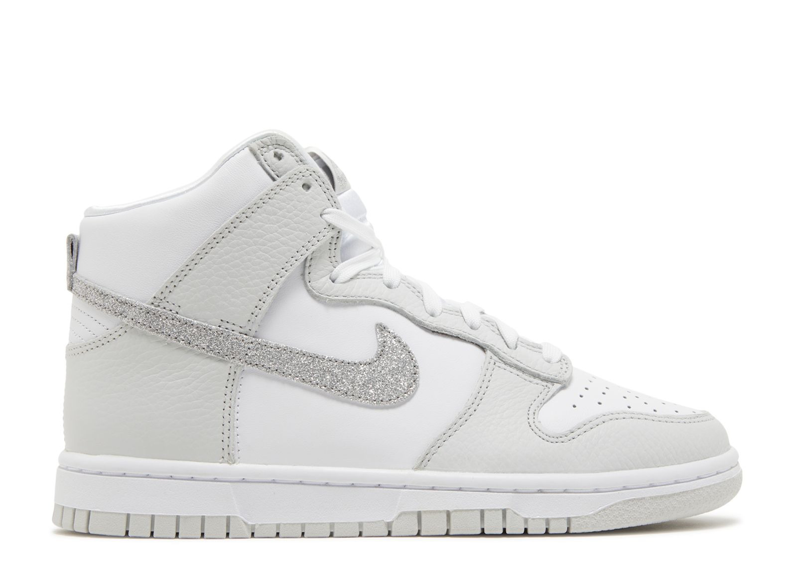 A classic basketball silhouette combines a neutral color palette with a touch of shimmer in the Nike Women's Dunk High 'Silver Glitter Swoosh.' Light grey overlays and a glittery Swoosh appear against a sleek leather upper in white. The sneaker sits on a sturdy cupsole with white sidewalls and a pale grey rubber outsole. The perforated toe box, padded collar, and nylon tongue with a woven Nike tag add traditional elements. SKU: FJ4578 100 Colorway: White/Photon Dust/Metallic Silver Release Date: 5/1/23