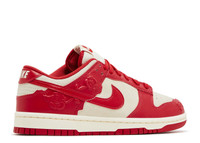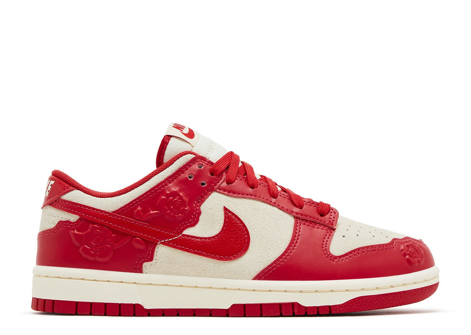 The Nike Women's Dunk Low 'Roses' sports a coconut milk suede upper contrasted by red overlays, decorated with roses on the toe, forefoot and heel. The Nike tag adorns the tongue, while an embroidered 'Nike' graces the leather back tab. The off-white midsole works with a red rubber outsole underfoot. SKU: HF1986 100 Colorway: Coconut Milk/University Red/Pale Ivory Release Date: 1/20/25