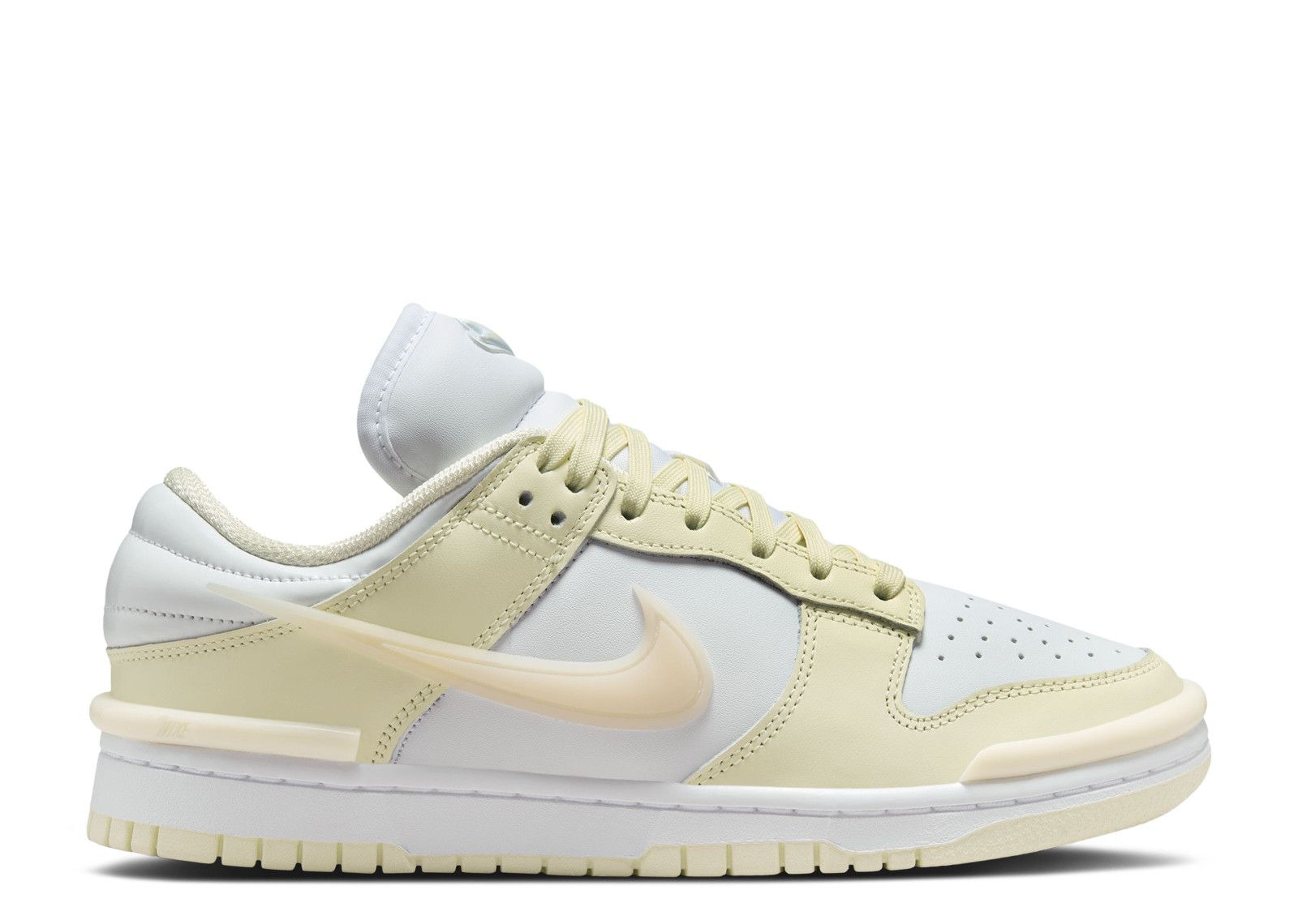 The Nike Women's Dunk Low Twist 'Coconut Milk' exaggerates the traditional details, including a Swoosh adorning the white leather upper. Light yellow overlays provide a touch of contrast on the forefoot and heel. Matching stitch work decorates the puffy collar, while the stuffed, elongated tongue showcases a raised Nike logo. Molded bumpers bolster the midsole, while a pale yellow rubber outsole anchors the look. SKU: DZ2794 104 Colorway: Coconut Milk/White/Guava Ice Release Date: 6/11/24