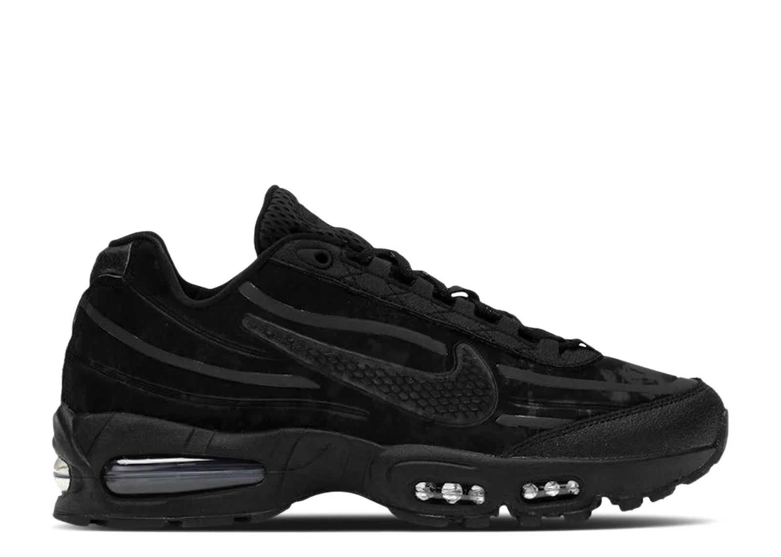 The WORKSOUT x Nike Air Max 95 'Black' rocks a glossy black foam midsole with Max Air cushioning for a comfortable feel. These sneakers have an updated lacing system and reflective overlays for better visibility. A textured Swoosh adorns the side panel, while a WORKSOUT signoff decorates the tongue. SKU: HQ0263 001 Colorway: Black/Black/Anthracite Release Date: 5/31/25
