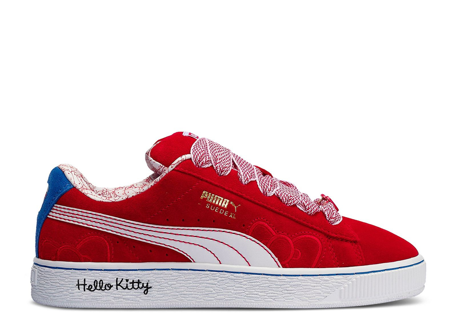 The Hello Kitty x PUMA Women's Suede XL 'Red Bow' carries a red suede upper secured with extra-wide shoelaces. A white leather Formstrip gets red stitching, while each side panel is decorated with Hello Kitty's bows. A Hello Kitty graphic appears on the tongue tag, along with an allover print on the collar lining. These shoes have a white, textured rubber midsole, etched with a 'Hello Kitty' signoff on the sidewall. SKU: 404231 01 Colorway: For All Time Red/White/Mountain Blue Release Date: 3/6/25