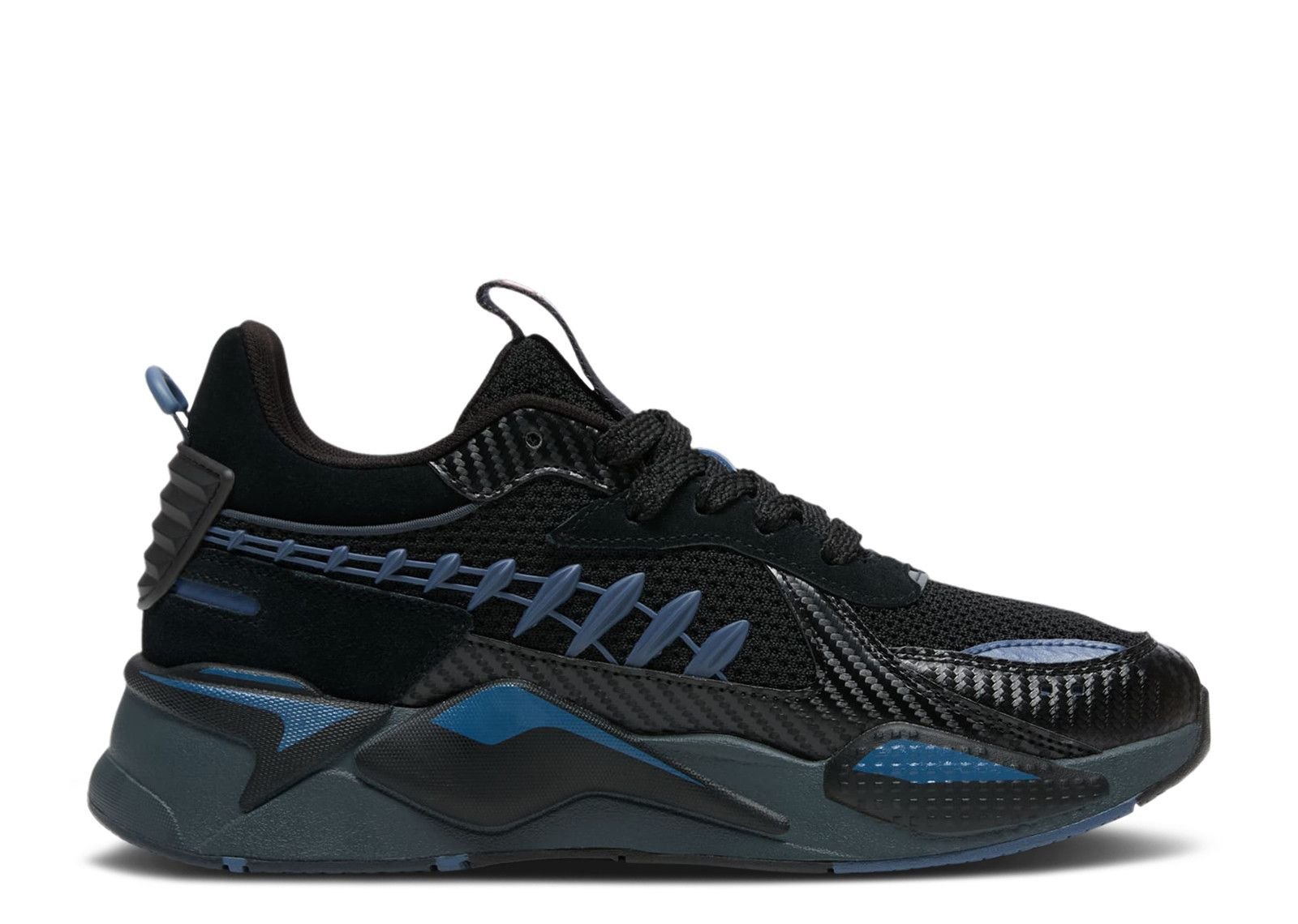 The Marvel x PUMA RS-X 'Black Panther' nods to King T'Challa, using the colors from the superhero's Vibranium suit. A black mesh upper is crafted with matching synthetic overlays and adorned by a Marvel emblem on the tongue and a navy Formstrip mirroring the appearance of Black Panther's necklace. A beefy foam midsole gets sculpted accents in black and blue to match the upper's design. SKU: 397742 01 Colorway: Black/Blissful Blue/Strong Gray Release Date: 6/22/24
