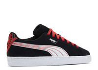 The Marvel x PUMA Suede 'Miles Morales' shoes sport a black suede upper with a white leather Formstrip popped with red stitching. The tongue tag shows both brands' logos, while a rubberized back tab graces Spider-Man's emblem. The textured white rubber midsole gets an embossed PUMA heel logo to finish the design. SKU: 397741 01 Colorway: Dark Night/White/For All Time Red Release Date: 6/22/24