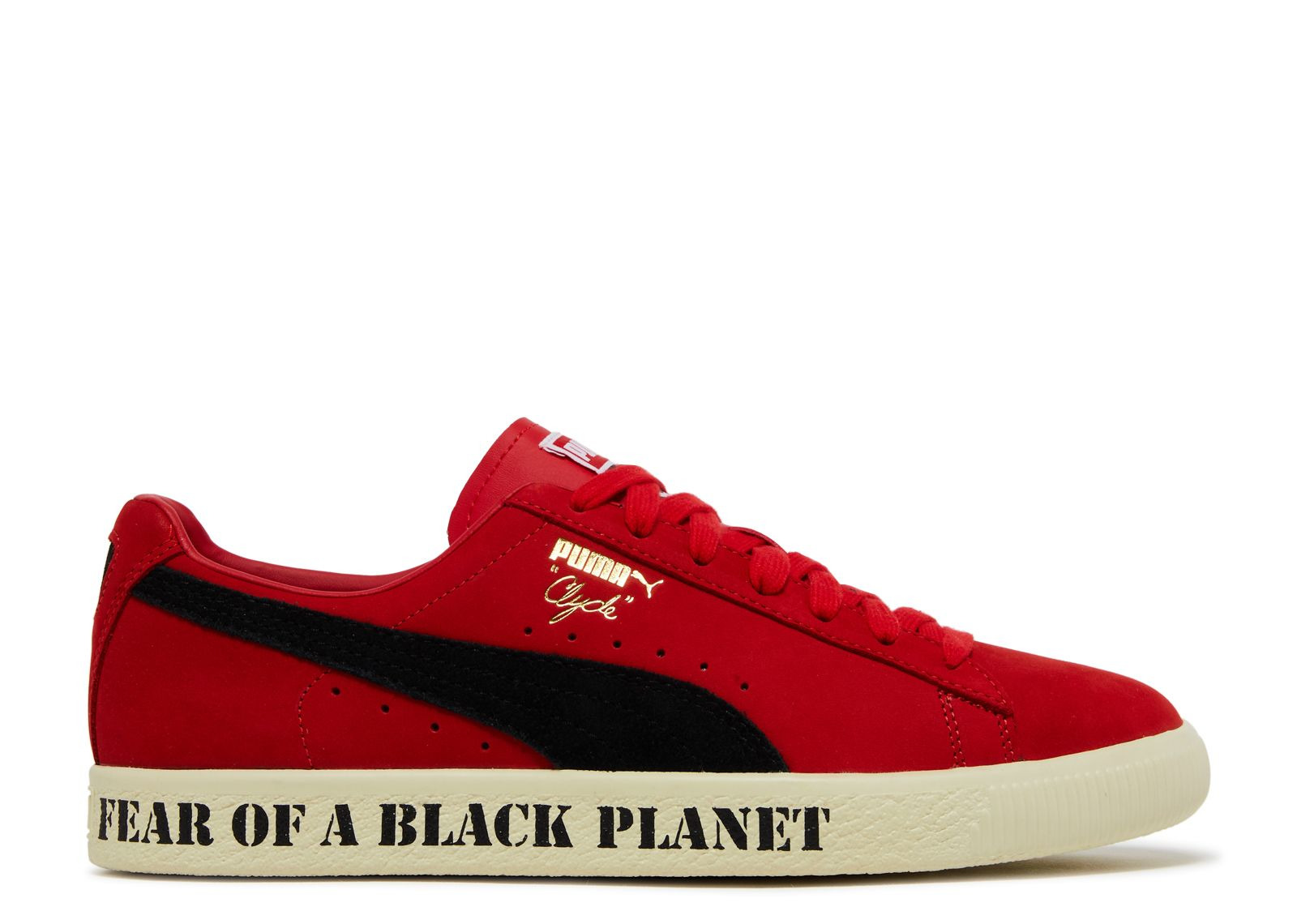 Celebrating the rap group's seminal third album, the Public Enemy x Clyde 'Fear of a Black Planet' features the signature phrase on the side wall of the midsole. Public Enemy's crosshairs logo appears on the heel patch, woven tongue tag and custom sockliner, while the upper itself is built with High Risk Red suede. A black Formstrip provides contrast, with gold-foil Puma branding on the quarter panel. SKU: 374539 01 Colorway: High Risk Red/Black Release Date: 4/9/20