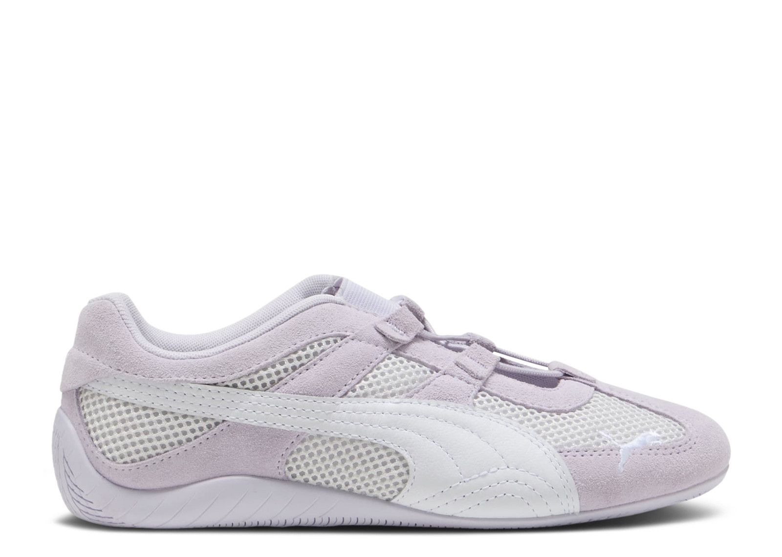 The PUMA Women's Speedcat Go 'Spring Lavender' remixes the look of the original Speedcat, a fireproof design made for Formula 1 racing. The open-cell mesh upper is secured with no-tie laces and an elastic strap, tooled with lavender suede overlays. A white leather Formstrip decorates the design, alongside PUMA's jumping cat logo embroidered on the toe area. A flat rubber outsole engulfs the heel as a nod to their motorsport inspiration. SKU: 403589 03 Colorway: Spring Lavender/White Release Date: 6/1/25