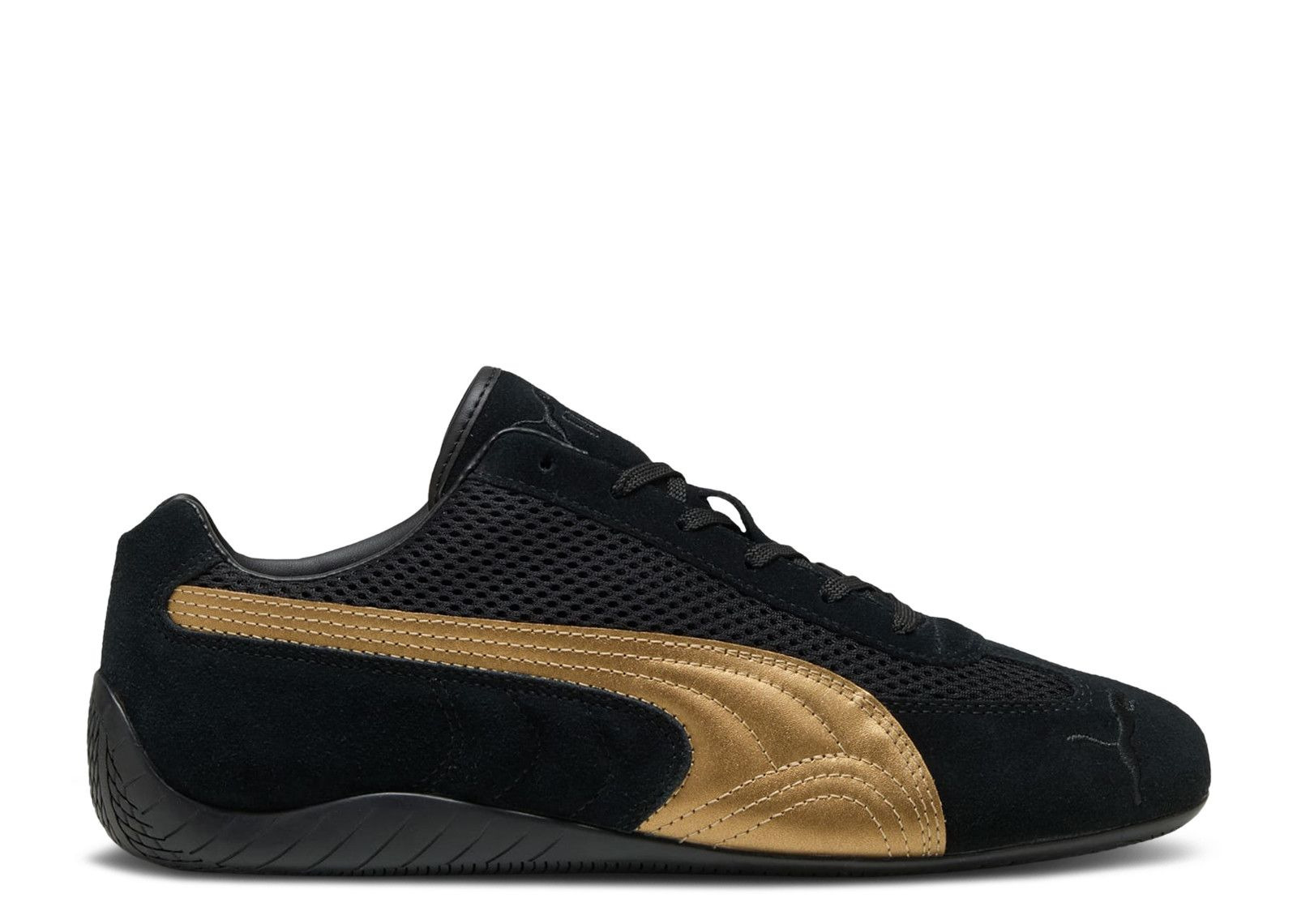 The PUMA Wmns Speedcat Premium 'Black Gold' dons a black mesh upper with matching suede overlays and a stitched, metallic gold Formstrip. The PUMA logo decorates the tongue, while a matching jumping cat logo is embroidered on the toe. Ortholite insoles pair with a tire-tread rubber outsole that engulfs part of the heel for more grip. SKU: 405355 06 Colorway: Black/Gold Release Date: 6/1/25