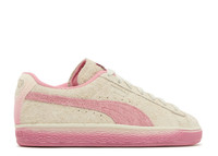 The PUMA Women's Suede 'California Dreamin' sports a light tan suede upper, contrasted by a pastel pink Formstrip and matching Lycra collar lining. 'PUMA Suede' is debossed on the side, while the jumping cat logo adorns the heel portion. A textured, gradient pink rubber midsole anchors the look. SKU: 395905 01 Colorway: Sugared Almond/Passionfruit Release Date: 5/1/24
