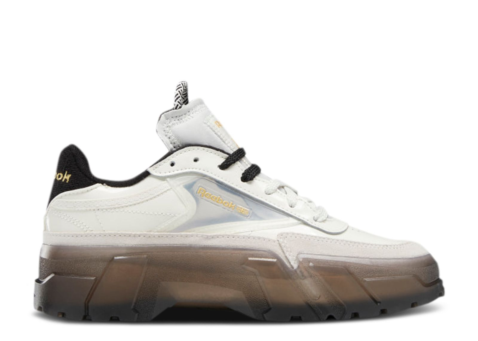 Reebok teamed up with Cardi B to create the Cardi B x Wmns Club C 'Chalk.' Inspired by high fashion and streetwear, the shoe's upper emerges with an off-white patent leather construction, with a braided pull-tab on the tongue. The side wall includes a transparent TPU window, while suede overlays the base of the shoe. Underfoot, a semitranslucent rubber cupsole anchors the build. SKU: FZ4928 Colorway: Chalk/Matte Gold/Core Black Release Date: 10/11/20