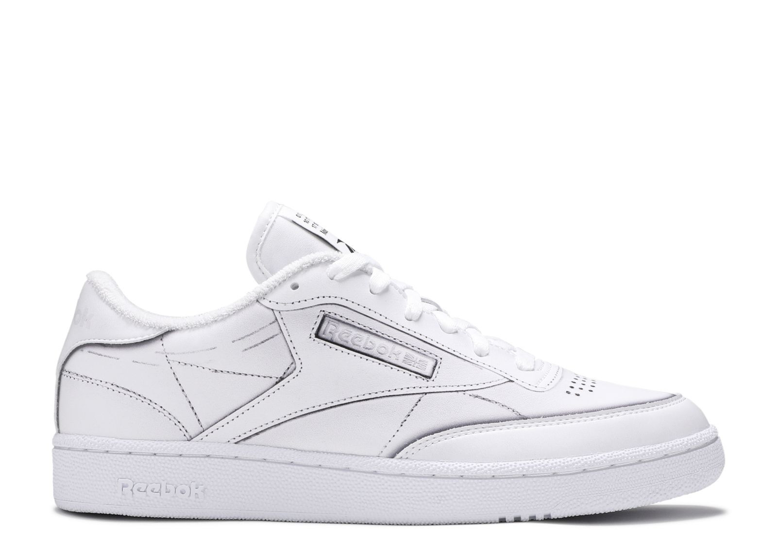 Inspired by Maison Margiela's Spring/Summer 1996 collection, which featured a trompe-l'oeil aesthetic, the Maison Margiela x Club C 'White' was made in collaboration with the luxury French fashion house. Built with a single piece of leather, the shoe's upper appears in white, with a scanned image of an OG Club C to create a 2D effect. The heel patch sports stitched detailing and the tongue tag includes a grid-style series of numbers, while underfoot, a rubber cupsole anchors the build. SKU: H02407 Colorway: White/Black/White Release Date: 3/23/21