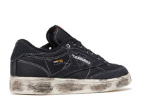 A distressed rendition on the retro silhouette, the Pleasures x Reebok Club C 85 'Black Chalk' has an upper made from a black Cordura textile with contrast white stitching and a tonal suede overlays at the forefoot, heel, and quarter panel. The LA streetwear's branding is on a woven tongue tag and a heart-shaped logo window cut on each lateral sides. A solid white rubber cupsole on the bottom is paired with pre-stained sidewalls for a vintage look. SKU: GW2643 Colorway: Black/Black/Chalk Release Date: 8/20/21