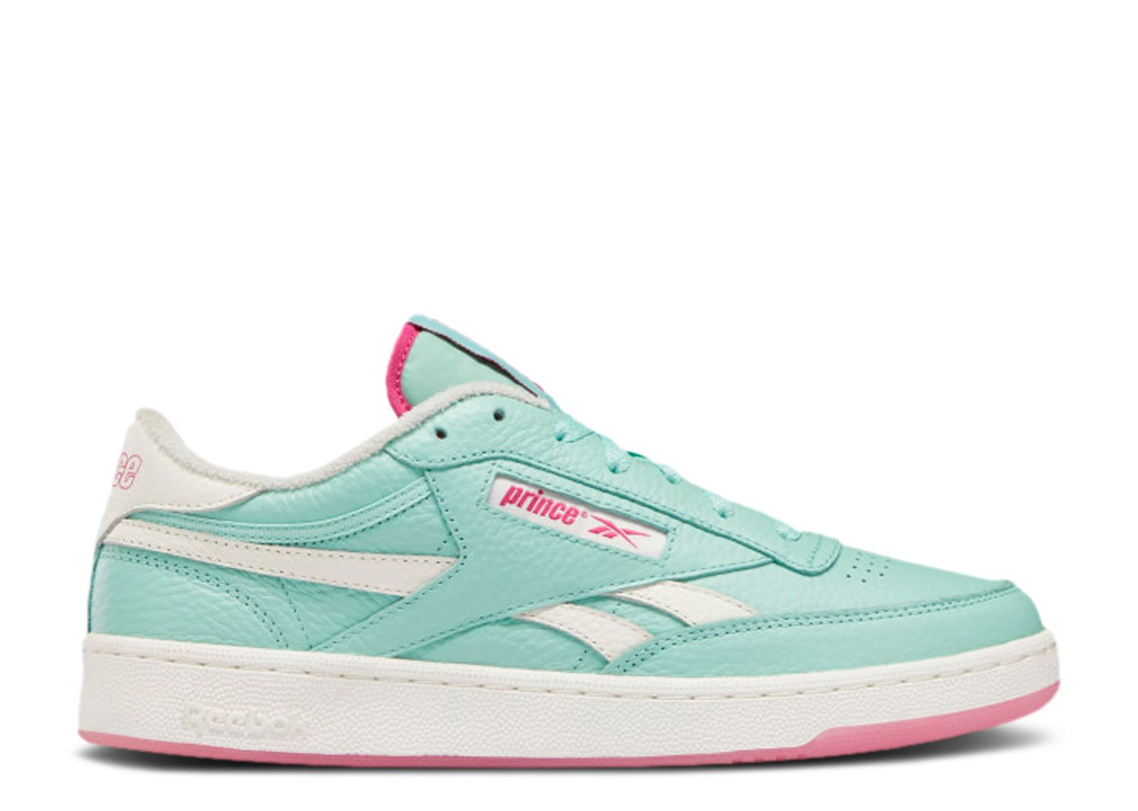 Exploring the silhouette's basketball roots through a collaboration with the legendary tennis brand is the Prince x Reebok Club C Revenge 'Semi Pixel Mint.' The tumbled leather upper has a bright turquoise finish with off-white side stripes and a contrasting pop of fuchsia on the tongue, which is repeated on the dual-branded logo window and tongue tag, as well as the mismatched Prince and Reebok wordmarks printed on each heel tab. It's built on a pink translucent rubber outsole with an oversized Prince logo appearing beneath. SKU: GY8055 Colorway: Semi Pixel Mint/Chalk/Rose Rage Release Date: 9/10/21