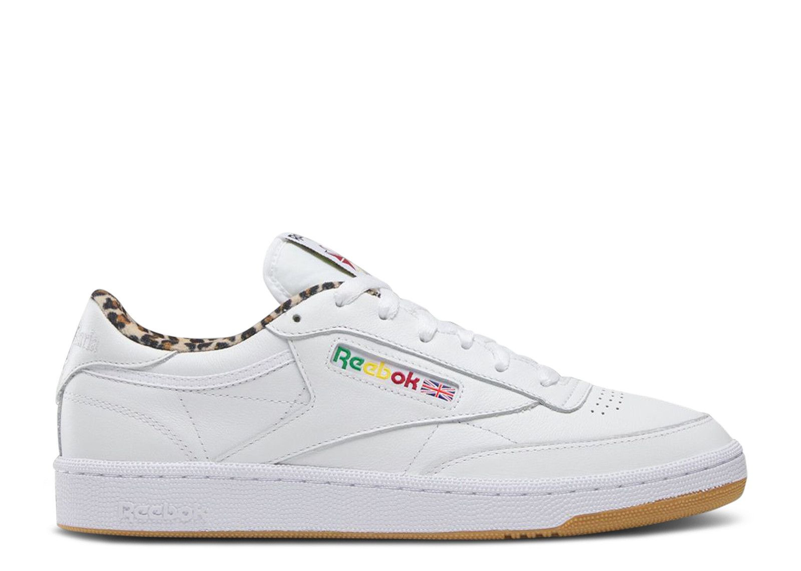 The Wacko Maria x Reebok Club C 85 'White Leopard Gum' shoes have a white leather upper with a leopard-print-lined collar. The Reebok emblem uses green, yellow, and red letters, while the white leather back tab has a matching Wacko Maria logo and an embroidered cannabis leaf. These shoes ride on a classic rubber cupsole, accompanied by a gum rubber outsole underfoot. SKU: 100208680 Colorway: White/Gum Release Date: 2/28/25