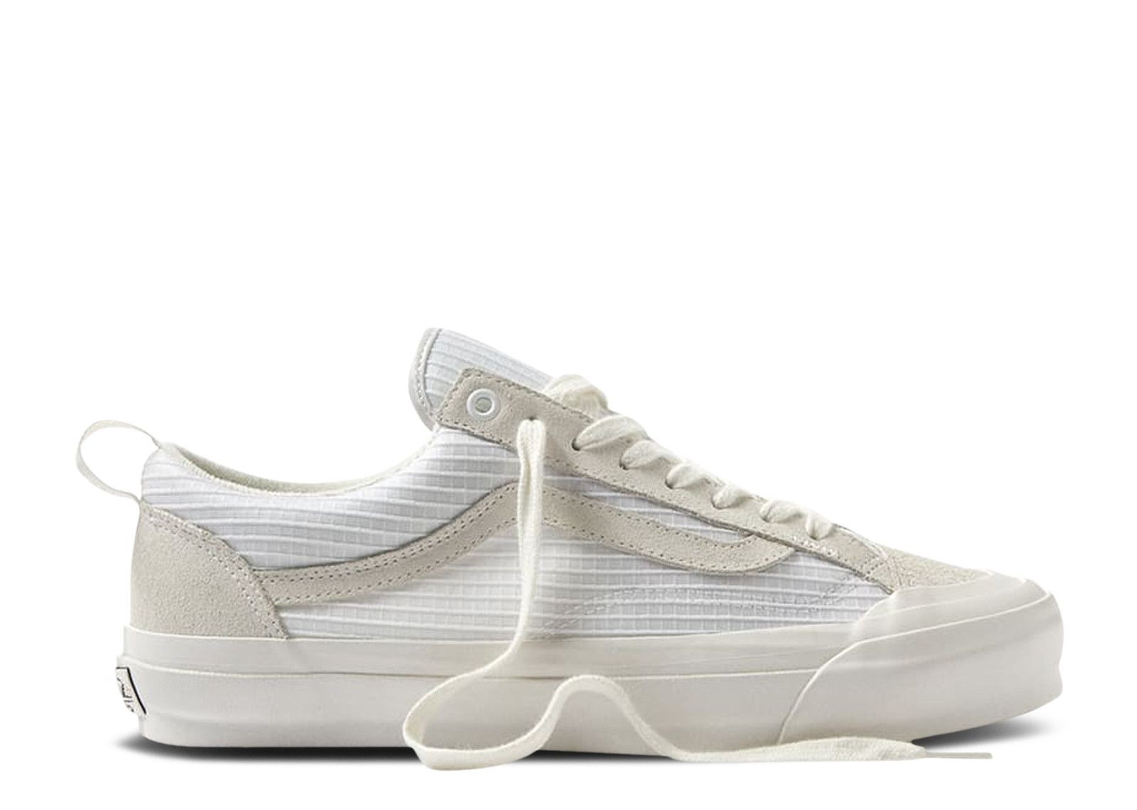 The END. x Vans Old Skool 136 LX 'Parachute' has a white nylon ripstop upper with matching suede toe, eyestay, heel, and jazz stripe. Details include a reinforced rubber toe cap, raised foxing, and a webbed pull tab for easy on and off. Vans' license plate decorates the heel, while both brand logos are present on the insoles. A waffle-traction rubber outsole underfoot brings traction to every step. SKU: VN000SHM07F Colorway: Bright White Release Date: 2/21/25