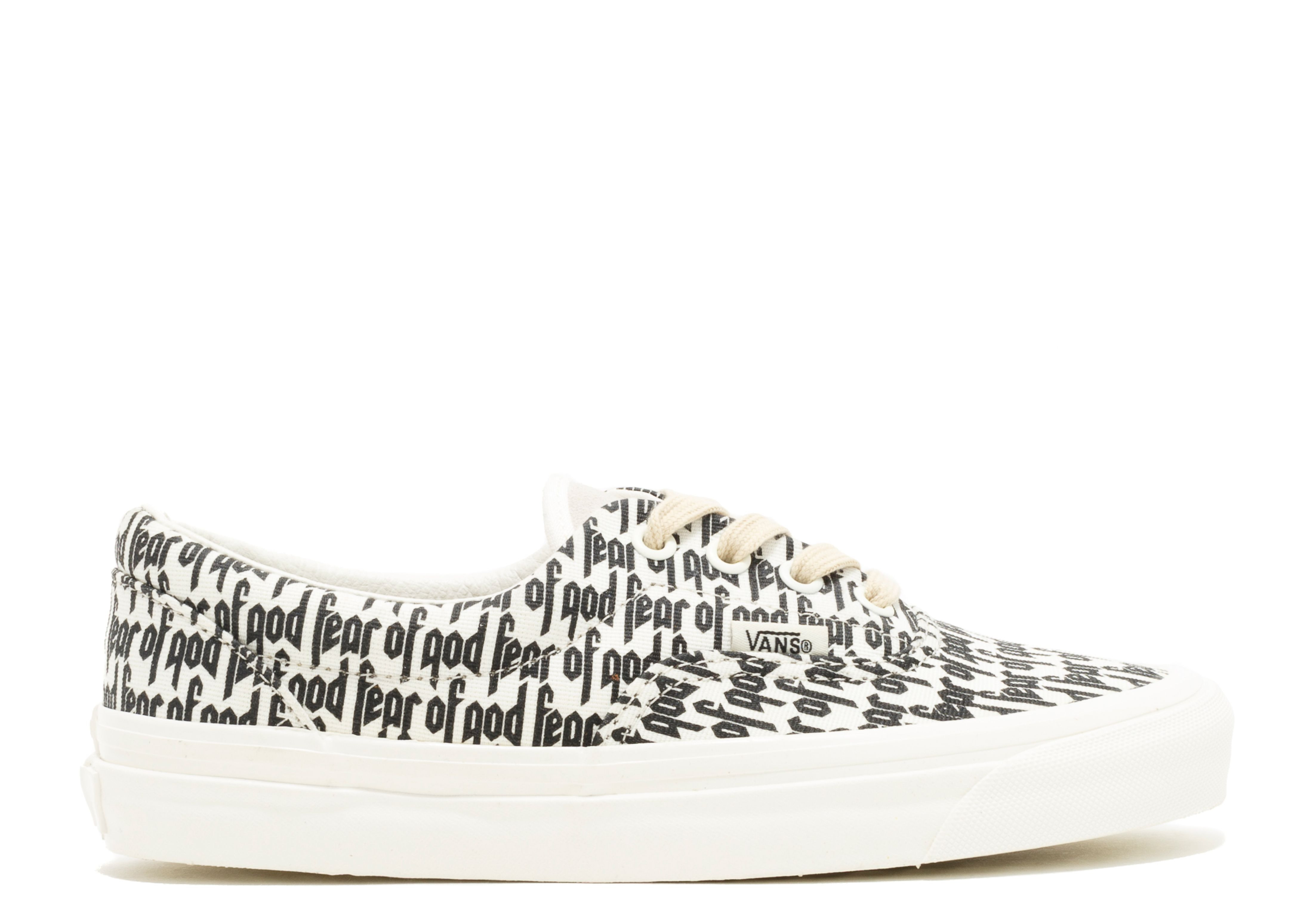 The Fear of God x Era 95 Reissue marks the Vans Era silhouette's 50th anniversary. The design features an off-white top covered with black Fear of God logos as part of the first collaboration between Jerry Lorenzo's F.O.G. label and Vans. The sneakers also dropped in limited numbers at select PacSun shops on October 8, 2016, released online on October 5th, 2016. The two-part release also included a black and tan take on the Sk8-Hi. SKU: VN0A2XRYML6 Colorway: Marshmallow/Black Release Date: 10/5/16