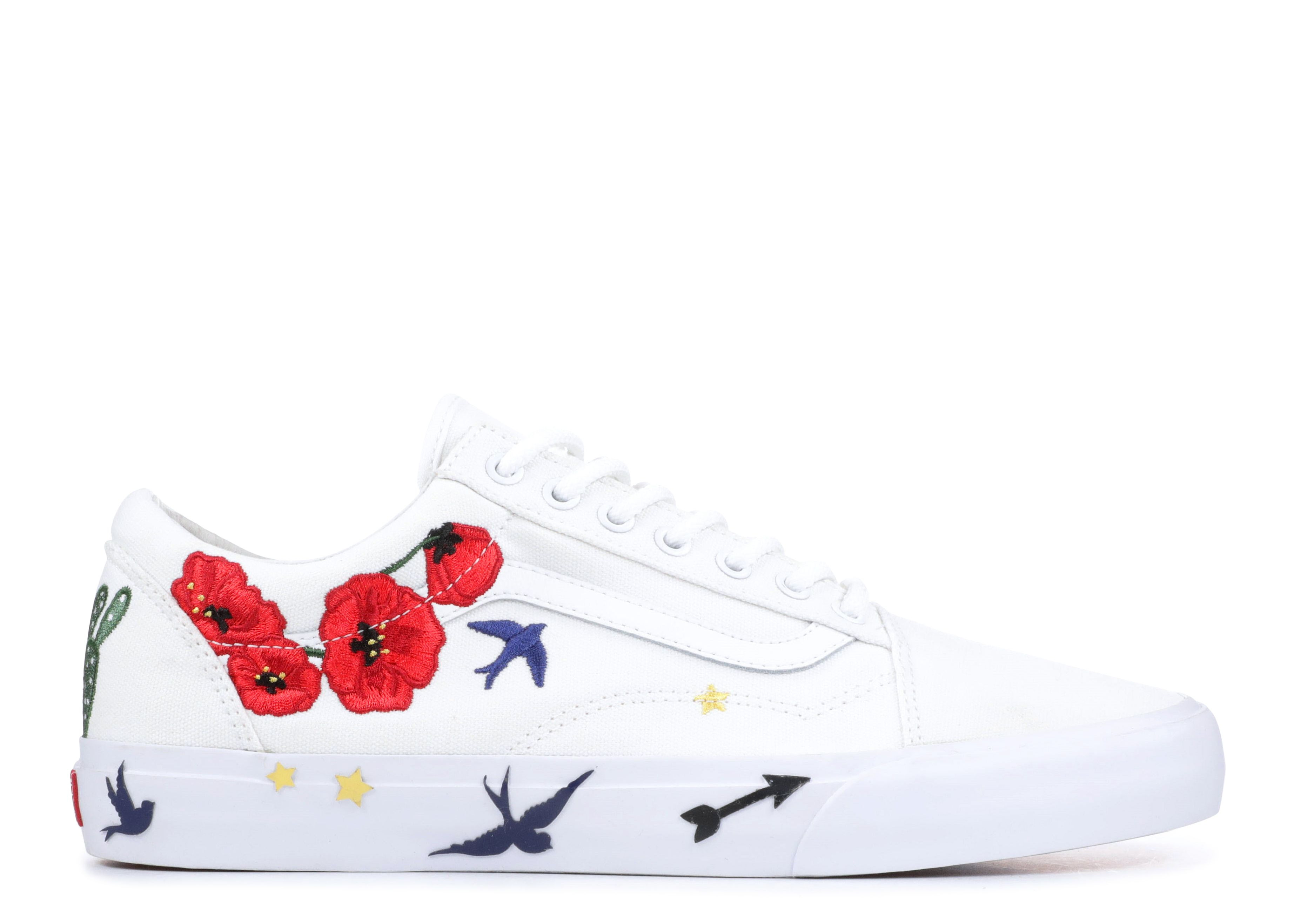 The Vans Old Skool has provided a backdrop for creative personalization since its 1977 debut. Reinvented as part of the 'Desert Embellish' collection unveiled in May 2018, this monochromatic model is heated up by desert flower, cacti, and bird embroidery with classic side stripes and suede reinforcements. Additional icons grace the sidewall of the matching midsole atop the intact waffle-treaded outsole. SKU: VN0A38G1T29 Colorway: True White/White Release Date: 10/10/18