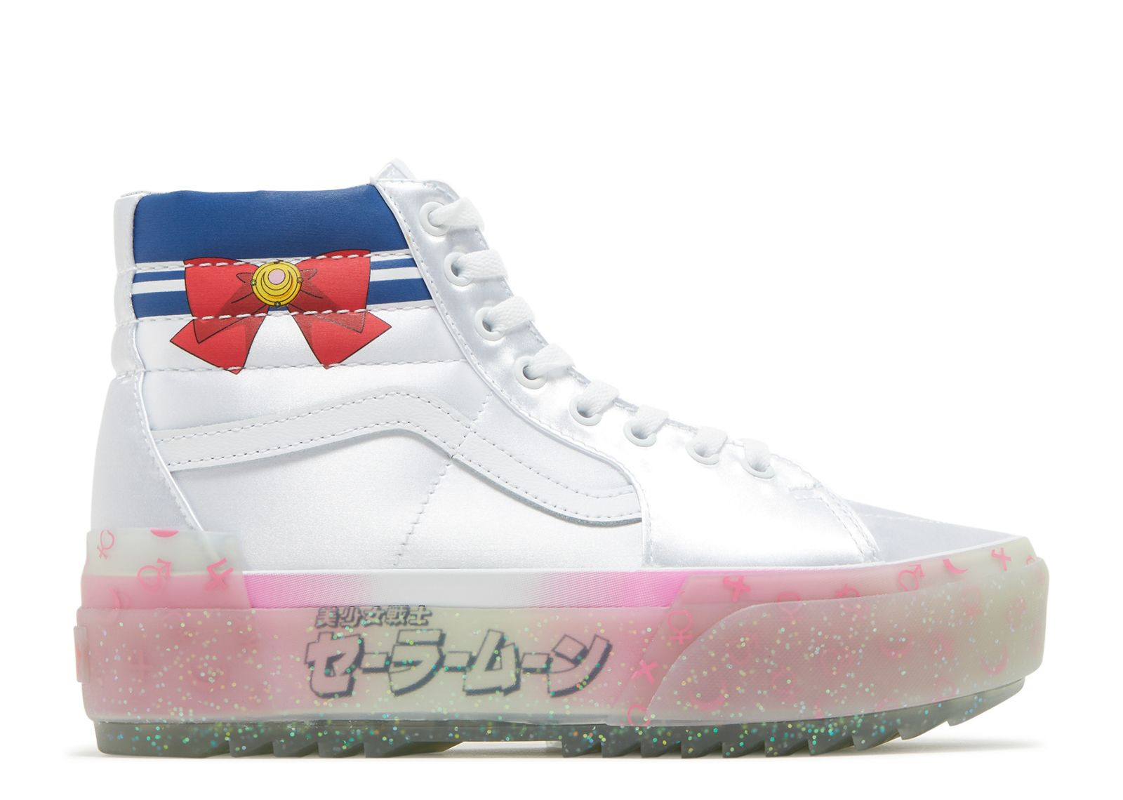 The Sk8-Hi gets revamped in a collaboration with the popular anime Sailor Moon. The usual canvas and suede found on the upper is replaced with a smooth white satin, featuring Sailor Moon's signature brooch and red bow near the ankle area. An elevated platform midsole features a translucent look, with glitter and planetary symbols combining with 'Sailor Moon' in Japanese characters. SKU: VN0A4BTWSLV Colorway: White/Silver Release Date: 6/10/22