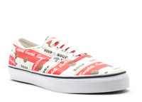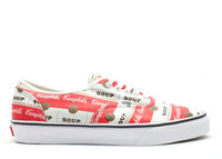 Inspired by American artist Andy Warhol in 2012, Supreme and Vans collaborated to reimagine the Authentic Pro, using his graphic style. This 'Campbell's Soup' edition reimagines his artwork in a repetitive motif over the canvas upper. The midsole sports high foxing tape and a badge on the heel that shows both brand logos. SKU: VN0Q0D6VL Colorway: Classic Whit/Red/Gold