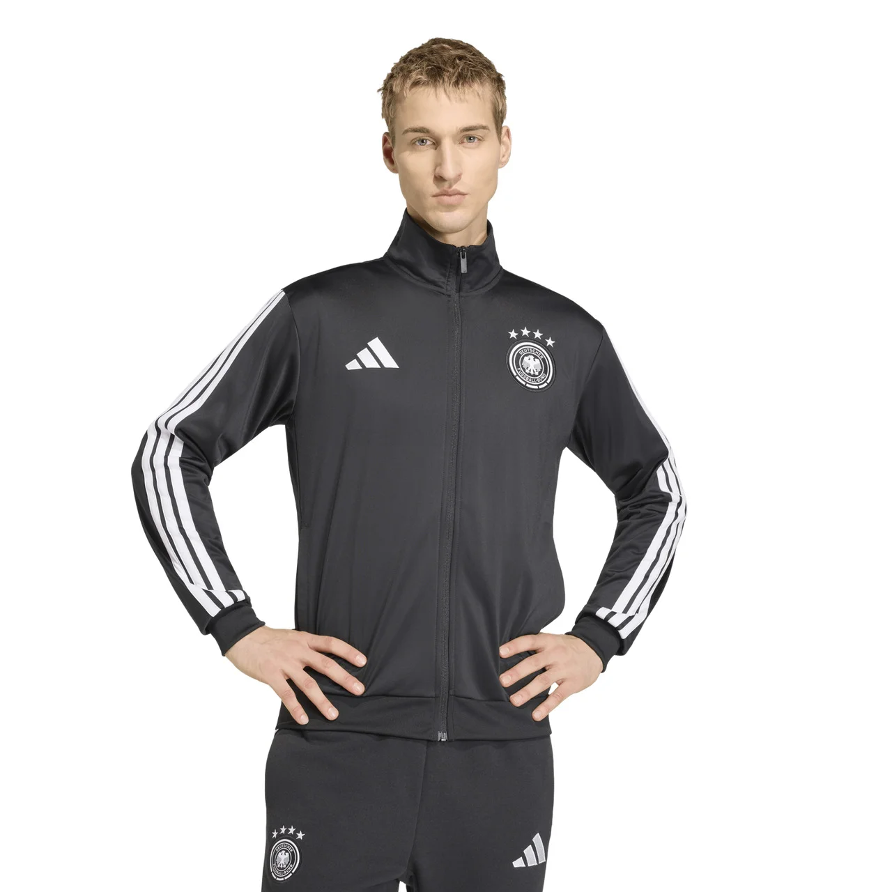 The adidas Germany DNA Track Top brings pure football heritage into the modern era, giving fans a staple that wears just as good on the streets as it does in the stands. Designed with a sleek stand-up collar and smooth zip-up closure, this track top blends classic confidence with contemporary edge. The iconic performance logo and bold 3-Stripes strike the perfect balance between sport and style, celebrating Germany's legendary legacy with unmistakable flair. Lightweight, versatile, and made for layering, the adidas Germany DNA Track Top is the perfect go-to for elevating your everyday fit. Regular fit offers a relaxed feel. Knit construction ensures comfort and durability. Tricot: 100% recycled polyester. Imported.