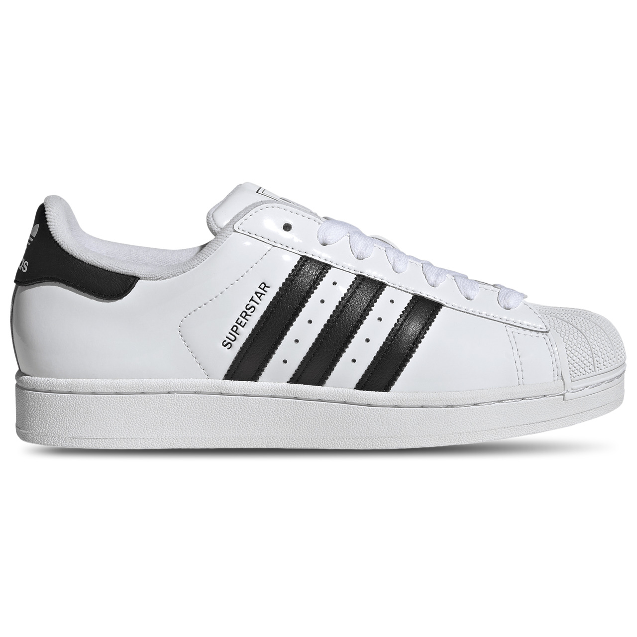 Score major style points and ball out with timeless cool in the adidas Originals Superstar II Patent. For over 50 years, these Superstar shoes have been a staple for icons in sports, music, and culture, constantly evolving while staying true to their basketball roots. The patent-leather and rubber upper with a shiny finish offers a sleek, polished look, and the serrated 3-Stripes add a signature touch. Featuring a soft terry lining and a distinctive rubber shell toe, these hardwood heroes-turned-streetwear sneakers deliver unbeatable comfort and iconic style for everyday wear. Step up your game and shine like a star with the adidas Originals Superstar II Patent. Regular fit ensures a relaxed feel. Textile lining provides step-in comfort.