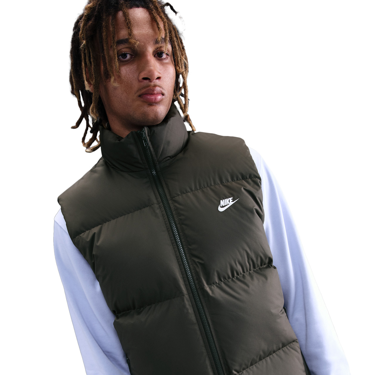 Stay warm and look cool with the Nike Club Puffer Vest 550. Featuring Nike Storm-FIT technology, this vest resists cold winds and water to keep you comfy during harsh weather. The zippered pockets keep your essentials secure, while the bungee drawcord at the bottom hem brings flexibility and styling options to the mix. Stay fashionably snug with the Nike Club Puffer Vest 550. Water-repellent finish ensures a dry and secure feel. Machine wash. Body/Lining: 100% polyester; Fill: Grey duck down (Minimum 85% down)/(APA version: 85% grey duck down/15% feathers). Imported.