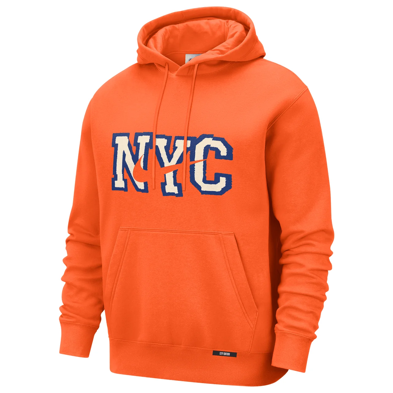 Bring the pulse of New York to every move with the Nike Knicks Club Logo City Edition Hoodie. Built for fans who ride or die for their team, this hoodie celebrates the grit and glory of Knicks basketball through bold design and city-driven energy. Crafted from midweight brushed fleece, this hoodie delivers a smooth outer finish and a soft, cozy interior that keeps you warm while holding its shape. Wear your pride, feel the energy, and let the Knicks spirit shine bright in the Nike Knicks Club Logo City Edition Hoodie. Kangaroo pocket helps keep hands warm. Body/Hood lining: 79% cotton/21% polyester; Rib: 98% cotton/2% elastane. Imported.