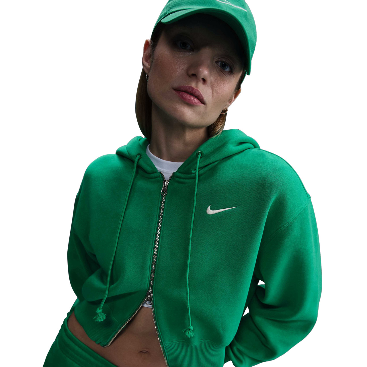 Discover the perfect blend of style, comfort, and versatility with the Nike NSW Phoenix Fleece Loose Crop Full-Zip Hoodie. Crafted from midweight brushed fleece, this cropped hoodie offers a super soft interior and a smooth exterior, keeping you cozy and stylish all day long. The elongated drawcords and wide ribbing provide a distinctive, signature look, while the dropped shoulders and a relaxed, loose fit make this hoodie ideal for layering. Throw on the Nike NSW Phoenix Fleece Loose Crop FZ Hoodie and tackle whatever the day brings with confidence. Nike NSW Phoenix Fleece Loose Crop FZ Hoodie features: Two-way zipper offers ease and convenience. Wide ribbed cuffs and hem ensure a stretchy and snug fit. Two-panel hood provides extra coverage. Embroidered Swoosh logo adds brand rep. Machine wash. 80% cotton/20% polyester; Rib: 97% cotton/3% spandex. Imported.