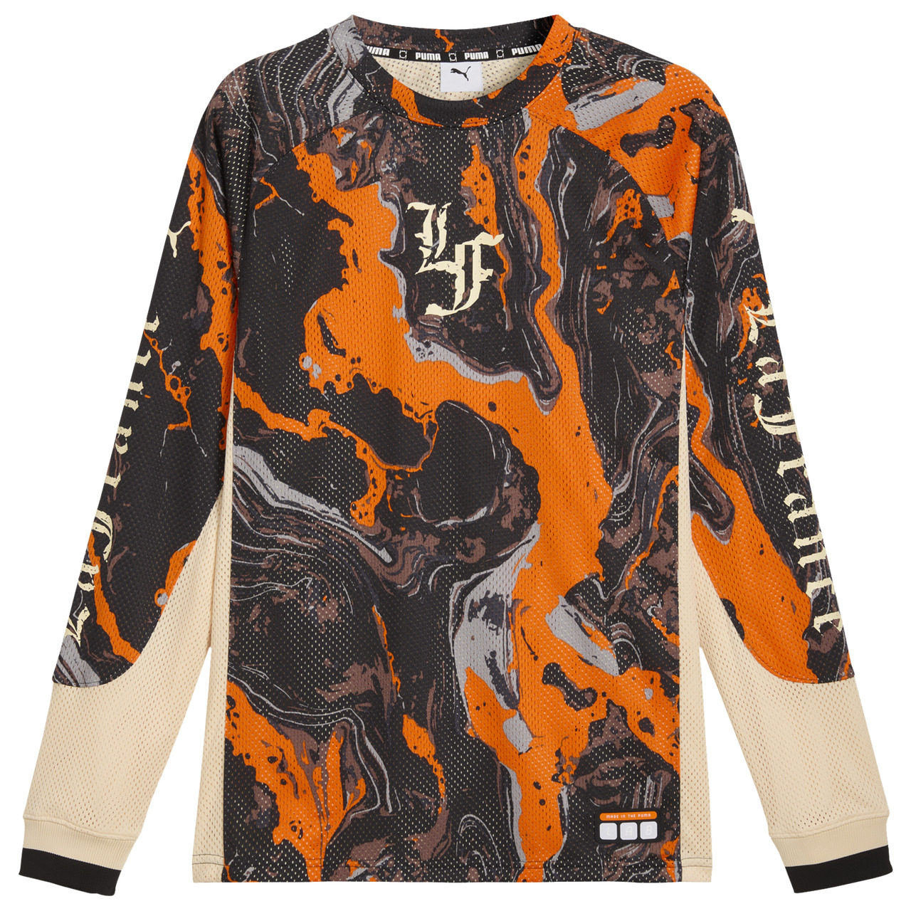 LaMelo Ball's collection isn't just worn; it's experienced! The PUMA LaFrance HEEM Moto Jersey brings Melo's bold vision to life, fusing street style with basketball heritage for a look that's as fearless as you are. Drawing inspiration from LaMelo's official lifestyle brand, LaFrance, this jersey provides a luxurious take on both on-court and off-court fashion. Featuring elements like fleur-de-lis designs, vibrant slime accents, and alien claw marks, this jersey embodies a cosmic aesthetic that's truly out of this world. Whether you're driving the lane or making moves off-court, the PUMA LaFrance HEEM Moto Jersey delivers elevated style and performance for those who dare to be different. PUMA LaFrance HEEM Moto Jersey features: Relaxed fit offers a comfortable feel. Long sleeves ensure coverage and comfort. Crew neck provides a snug fit. LaFrance branding delivers a signature look. PUMA basketball branding adds a sporty flair. Lining/Shell: 100% polyester; Rib: 95% polyester/5% elastane. Imported.