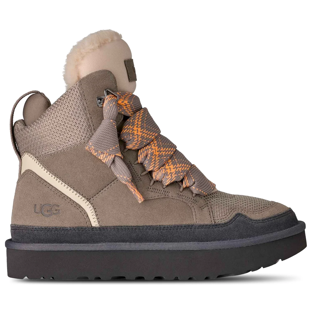 Where heritage meets innovation, the UGG Highmel makes its mark with a bold silhouette and elevated ease. Inspired by the iconic Neumel and reimagined as a high-top sneaker, these standout shoes blend street-ready flair with premium materials and conscious design. Crafted from a luxe mix of suede and recycled ballistic canvas mesh, these shoes deliver texture, structure, and modern edge. Sculptural details like the oversized padded tongue and webbing heel strap add dimension, while the embossed The UGG Logo patch brings a signature finish. Inside, the UGGplush lining and insole wrap your feet in next-level softness. Underfoot, the sugarcane EVA outsole offers lightweight cushioning with a sustainable twist. Style the UGG Highmel your way to bring elevated design and effortless sophistication to every look. UGG Highmel features: Recycled ballistic canvas mesh and suede upper delivers a premium feel. Two-tone flat lace made from 100% UNIFI recycled polyester fibers enhances visual appeal. Oversized padded tongue adds bold style and comfort. Padded collar offers all-day ease. EVA footbed ensures lightweight comfort. Embossed The UGG Logo brings brand authenticity Lining and insole: 10 mm UGGplush (60% upcycled wool/40% TENCEL Lyocell). Sugarcane EVA outsole provides durable traction. *Each pair comes with an additional set of laces.
