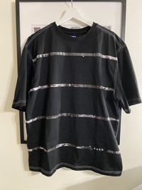 ⚠️ Due to the U.S. border regulations, expect duties. ⚠️ Size: 2 (M-L). Condition: Used. - Tonal bonded stripes with graphic pattern in white throughout. - Rib knit crewneck collar. - Logo print at waist. - Embroidered graphic in white featuring loose thread detailing at back collar. - Contrast stitching in white. - Oversized fit. - 75% cotton, 25% polyester. - Made in South Korea. Ships from Canada. Please message me if you have any questions or concerns!