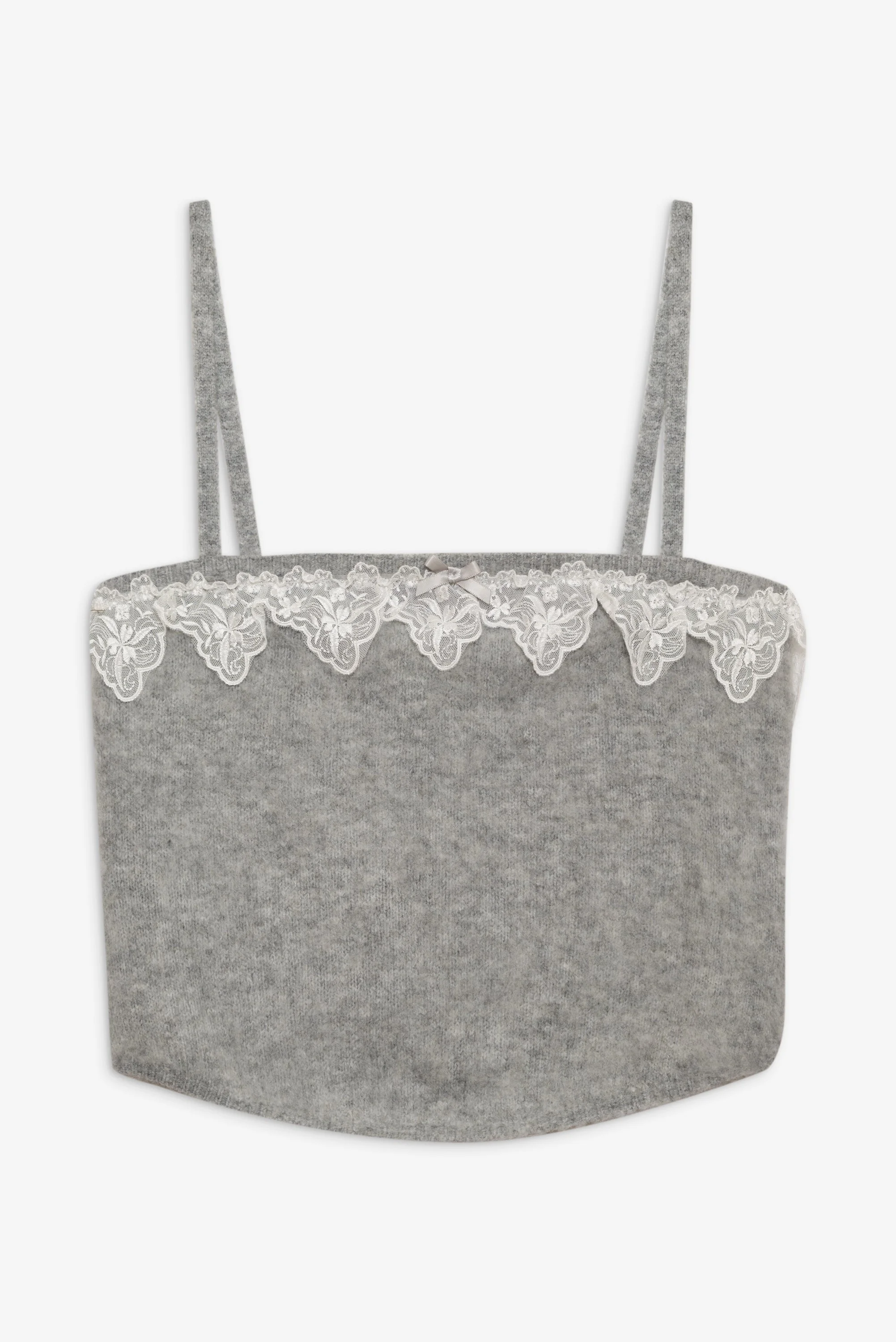 For Love & Lemons Essentials: A subtle and sexy take on 9-5 essentials, the Arinah grey tank is crafted in the softest thin mohair. This sweater tank top is adorned with decorative scalloped lace along the neckline, as well as rib finishes and decorative satin bows at the straps. Pair it with the Arinah Boyshort for a co-ord set. Fit Notes - The Arinah Tank is designed to be fitted. We suggest taking your usual size. Style Notes - Unlined Fabric + Care - Crafted in 68% acrylic, 26% nylon, 6% spandex - Dry clean only