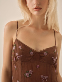 FOR LOVE & LEMONS KEEPSAKES: Ethereal and exquisite, the Beaded Garden brown mini dress is designed to turn heads at every party. Cut to a body-skimming ft, this party dress spotlights intricate hand-beaded bows and florals, plus tiered lace trims. This vintage-inspired beaded dress is the perfect piece for winter soirees. Style Notes - Lined in chiffon - Invisible zipper at side seam - Adjustable skinny shoulder straps - Functional keyholes and covered buttons at the center-back Fabric + Care - Crafted in 100% viscose - Dry clean only