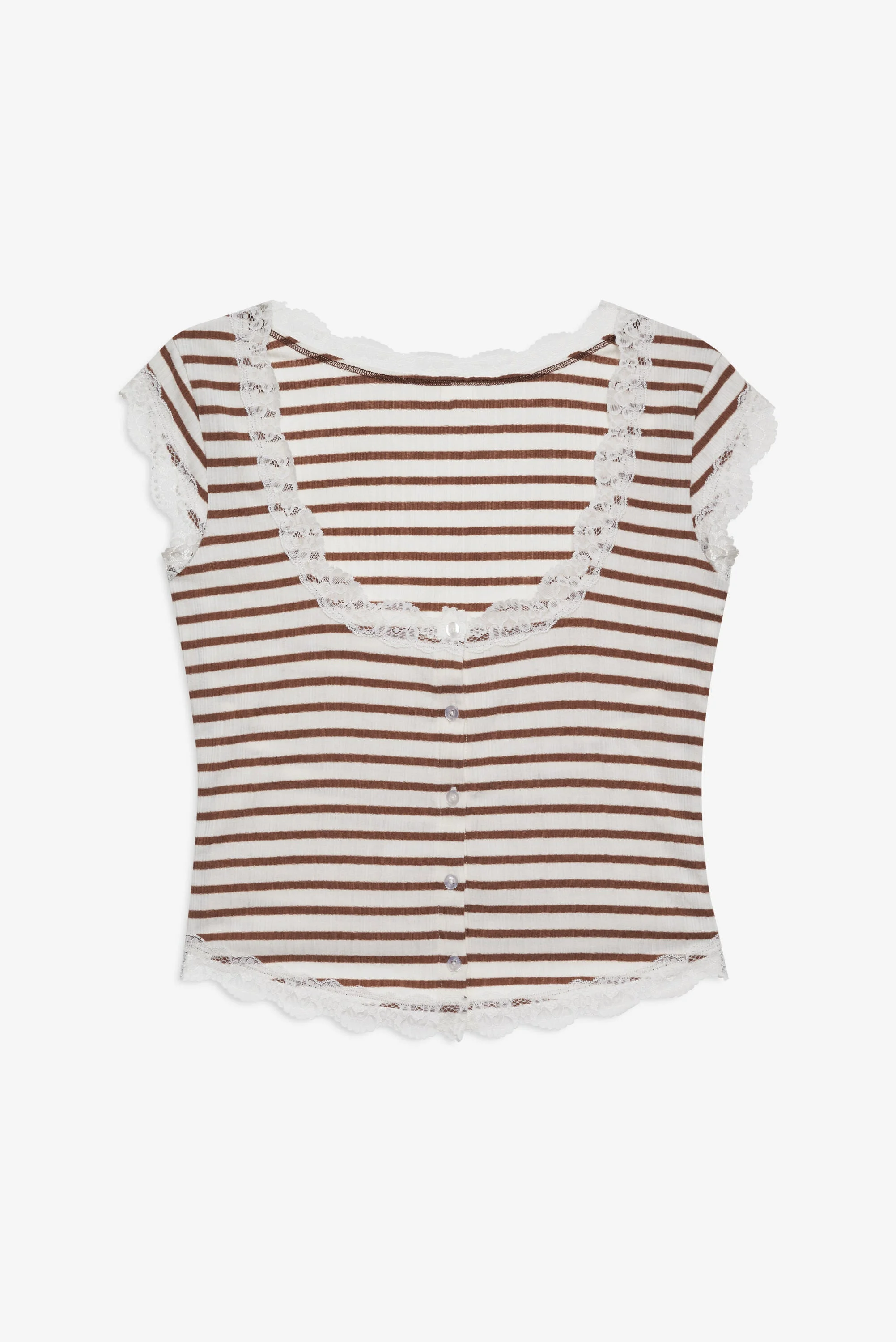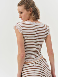 For a look that feels like home, the Bella striped crop top was designed for lounging, layering, and everything in between. Crafted in a cream and brown stripe, this sleep top spotlights a deep scooped neckline, cap sleeves, functional button-front opening, and is adorned with lace trims throughout. Pair with the Bella Wide Leg Pant for the complete pajama set. Style Notes - Unlined Fabric + Care - Crafted in 100% polyester - Lace is made of 90% polyamide, 10% elastane - Machine wash cold - Only non-chlorine bleach - Tumble dry low - Cool iron - Do not dry clean