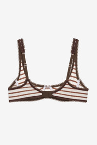 For a look that feels like home, the Bella unlined bra was designed for lounging, layering, and everything in between. Crafted in a brown and cream stripe, this underwire bra spotlights a contoured scooped cup shape and is adorned with scalloped picot trims and a rosette at front. Pair with the Bella Thong Panty for the complete lingerie set. Style Notes - Adjustable shoulder straps - Clasp closure at center-back Fabric + Care - Crafted in 100% polyester - Lining is made of 100% polyster - Hand wash cold - Only non-chlorine bleach - Do not wring or twist - Line dry - Do not iron - Do not dry clean
