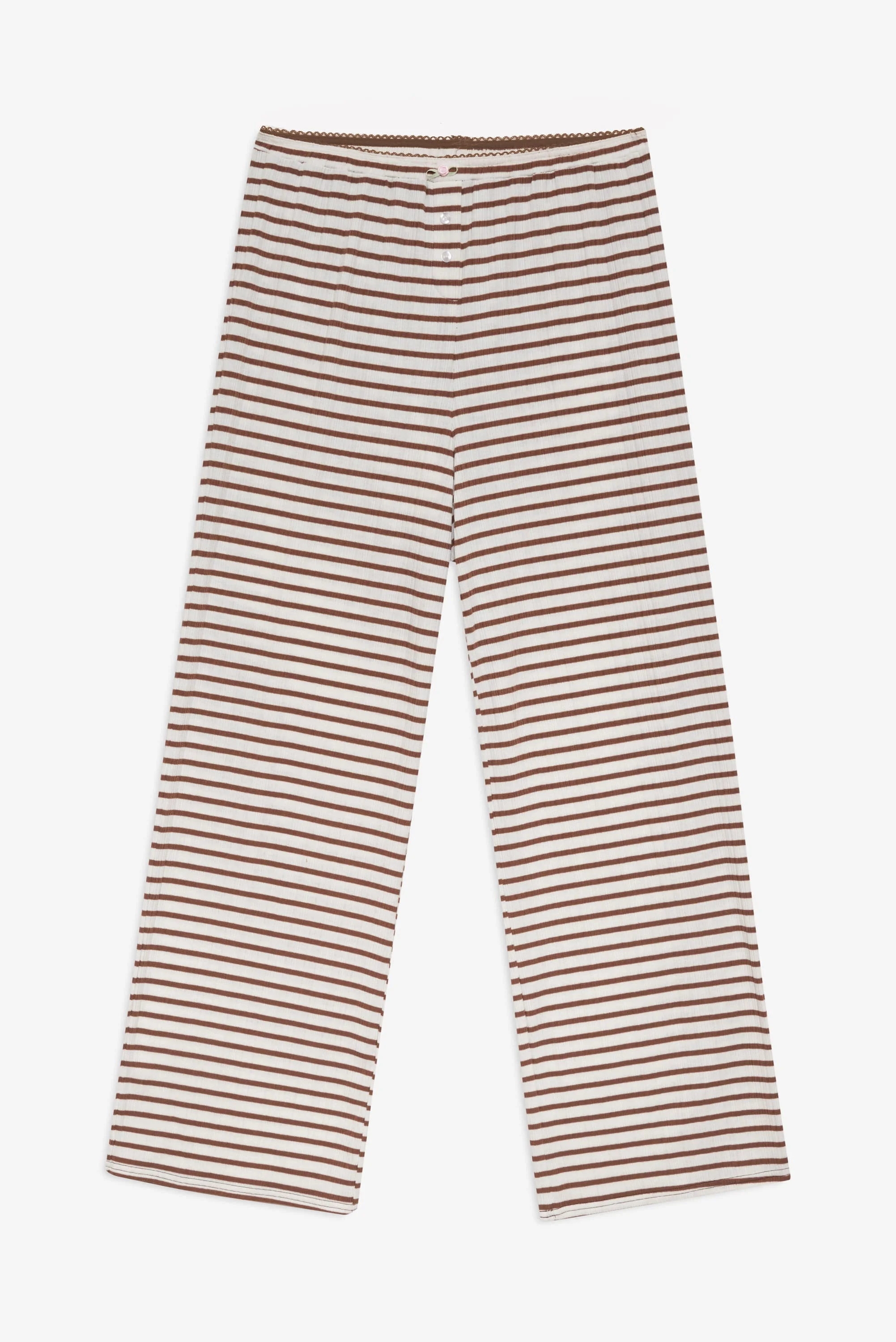 For a look that feels like home, the Bella striped pants were designed for lounging, layering, and everything in between. Crafted in a brown and cream stripe, these wide leg pants spotlight a faux front button fly, elasticized waistband, and are finished with scalloped picot trim. Pair with the Bella Sleep Top for the complete pajama set. Style Notes - Unlined - Semi-sheer Fabric + Care - Crafted in 100% polyester - Machine wash cold - Only non-chlorine bleach - Tumble dry low - Cool iron - Do not dry clean