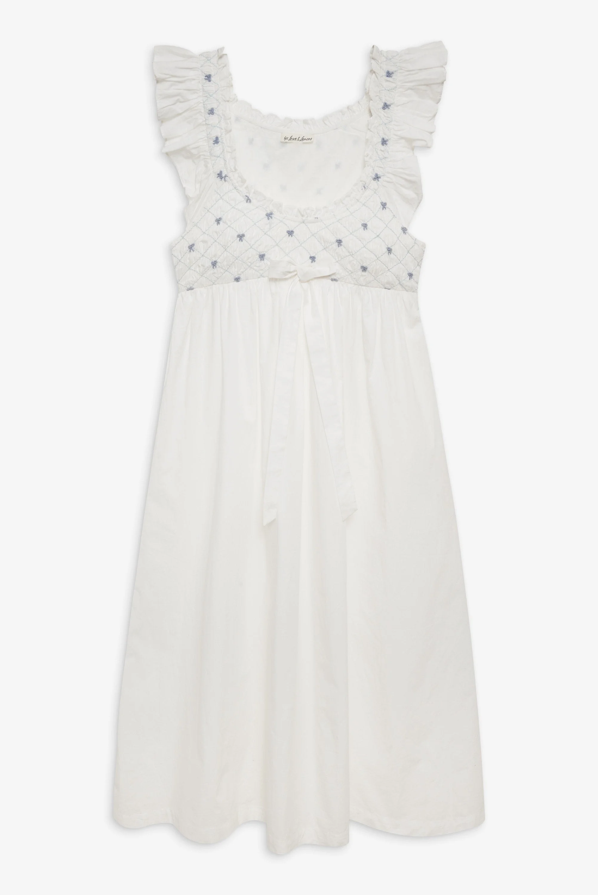 Made for barefoot walks, the Birdie Bow Smocked white midi dress exudes effortless beauty. Adorned with a dainty blue bow embroidered smocking at bust and back, a wide ruffled neckline, and fluttered sleeves, this white midi slip dress features a low back cut-out and an easy babydoll silhouette. Style Notes - Elasticated waist - Bow detail at center-front Fabric + Care - Crafted in 100% cotton - Lining is made of 100% cotton - Machine wash cold - Lay flat to dry - Cool iron ok - Ok to dry clean
