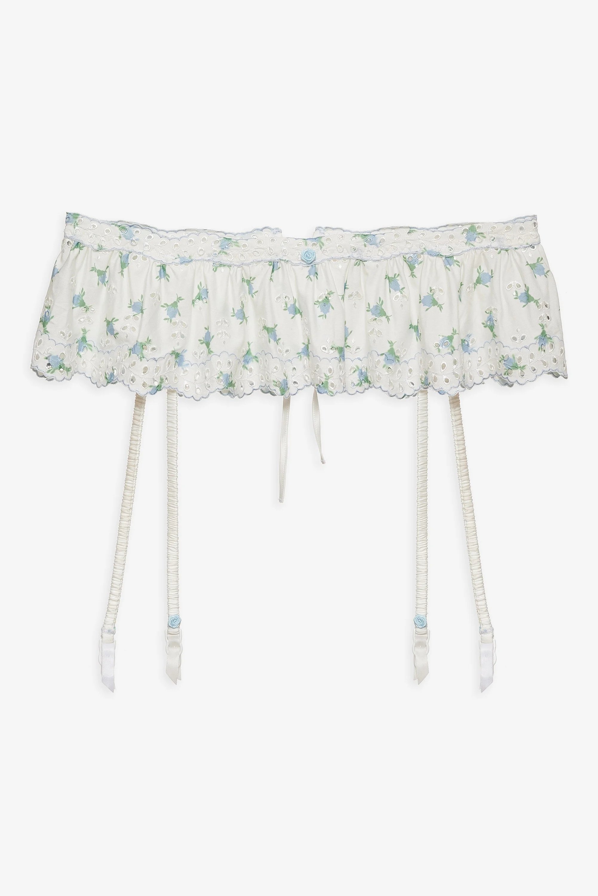 An ode to rolling fields and blooming wildflowers, the Budding Blossom white garter belt is crafted in a floral-printed white eyelet that exudes spring serenity. This eyelet garter is adorned with sweet ruffles, a dainty scalloped trim, and a delicate center front rosette. this eyelet garter features functional garter clips and a center back tie closure. Style Notes - Scrunchie elasticized garter straps - Functional garter clips - Center-back tie closure Fabric + Care - Crafted in 89% polyester, 11% elastane - Embroidery is made of 100% polyester - Hand Wash Cold - Line dry - Do not dry clean